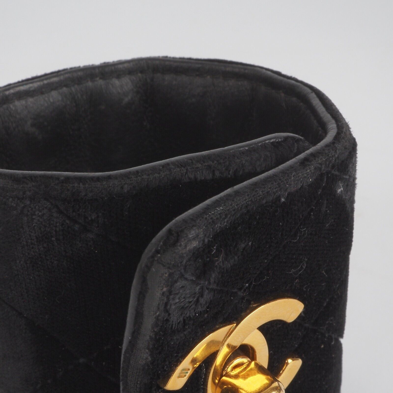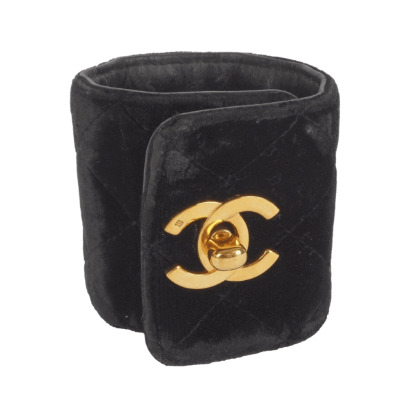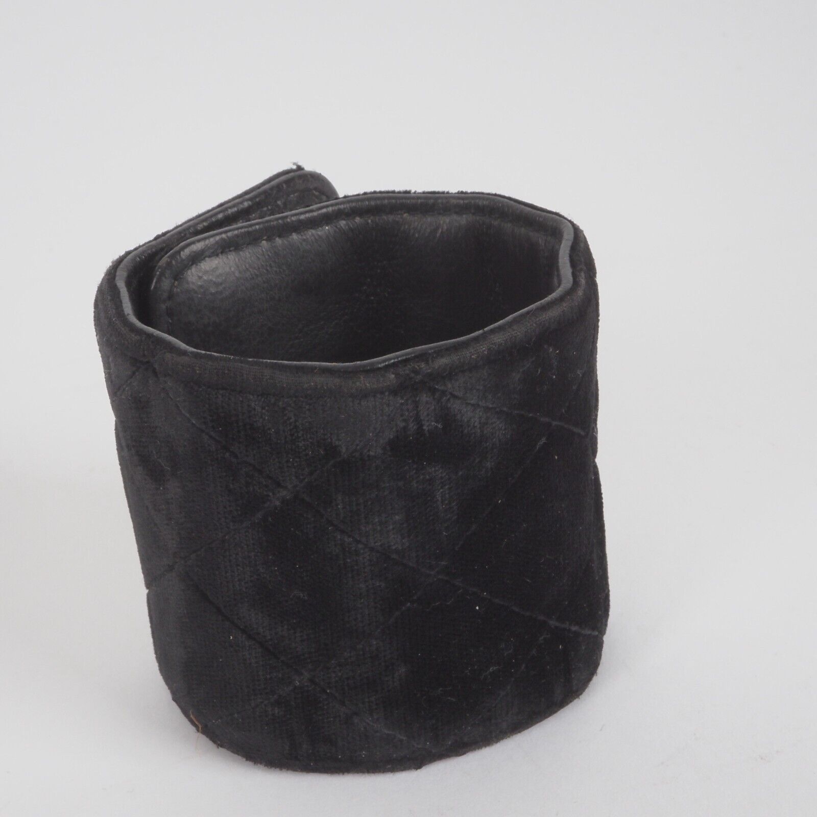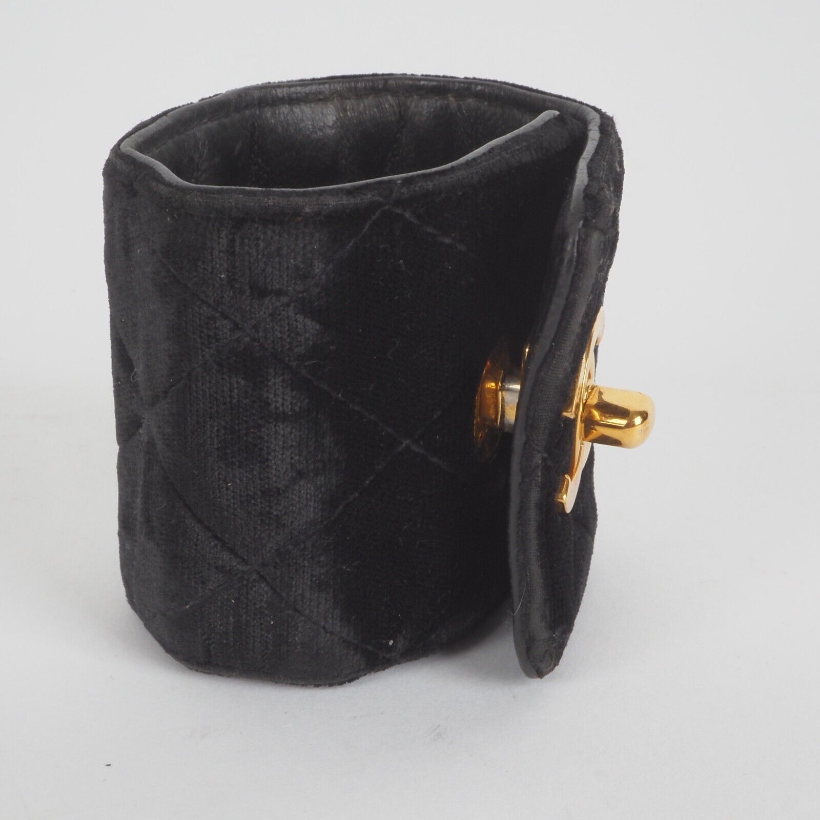 Dieses wunderschöne Turnlock Armband von Chanel wurde aus samt und Leder in Frankreich Handgefertigt. Vintage, in gebrauchtem Zustand, ohne Flecken oder Risse. Innendurchmesser ca. 46 mm.