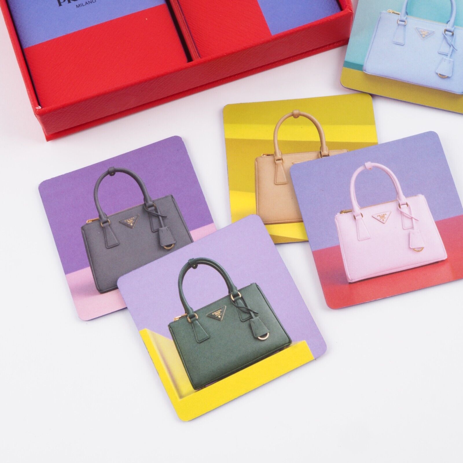 Dieses kleine Spielkartenset von PRADA besteht aus 16 Karten mit bunten Handtaschen. Die Karten sind in einem Hartschale-Karton mit Saffiano Leder Optik. Der Karton ist an einer Ecke leicht eingedrückt, sonst ist das Set neu und vollständig. Für Sammler und Prada- Liebhaber.