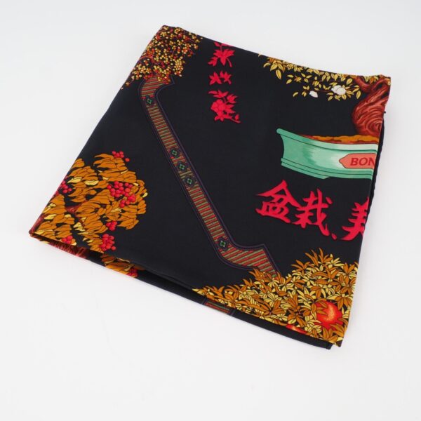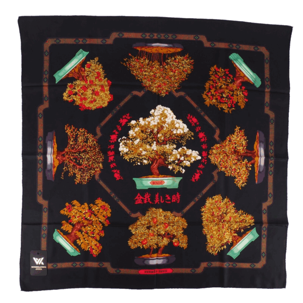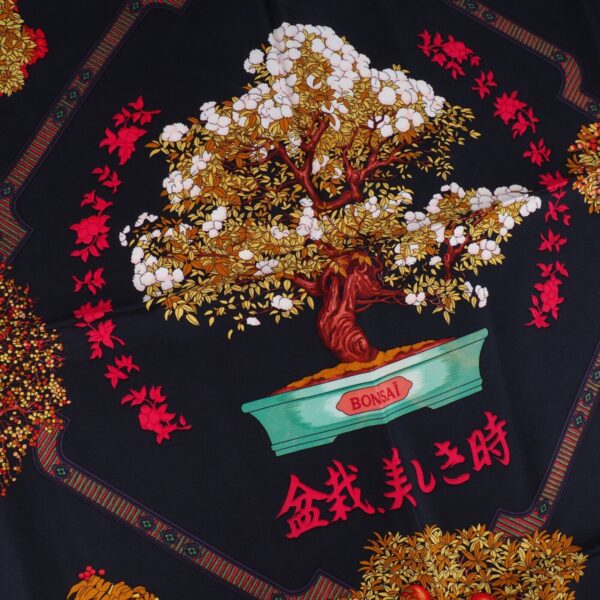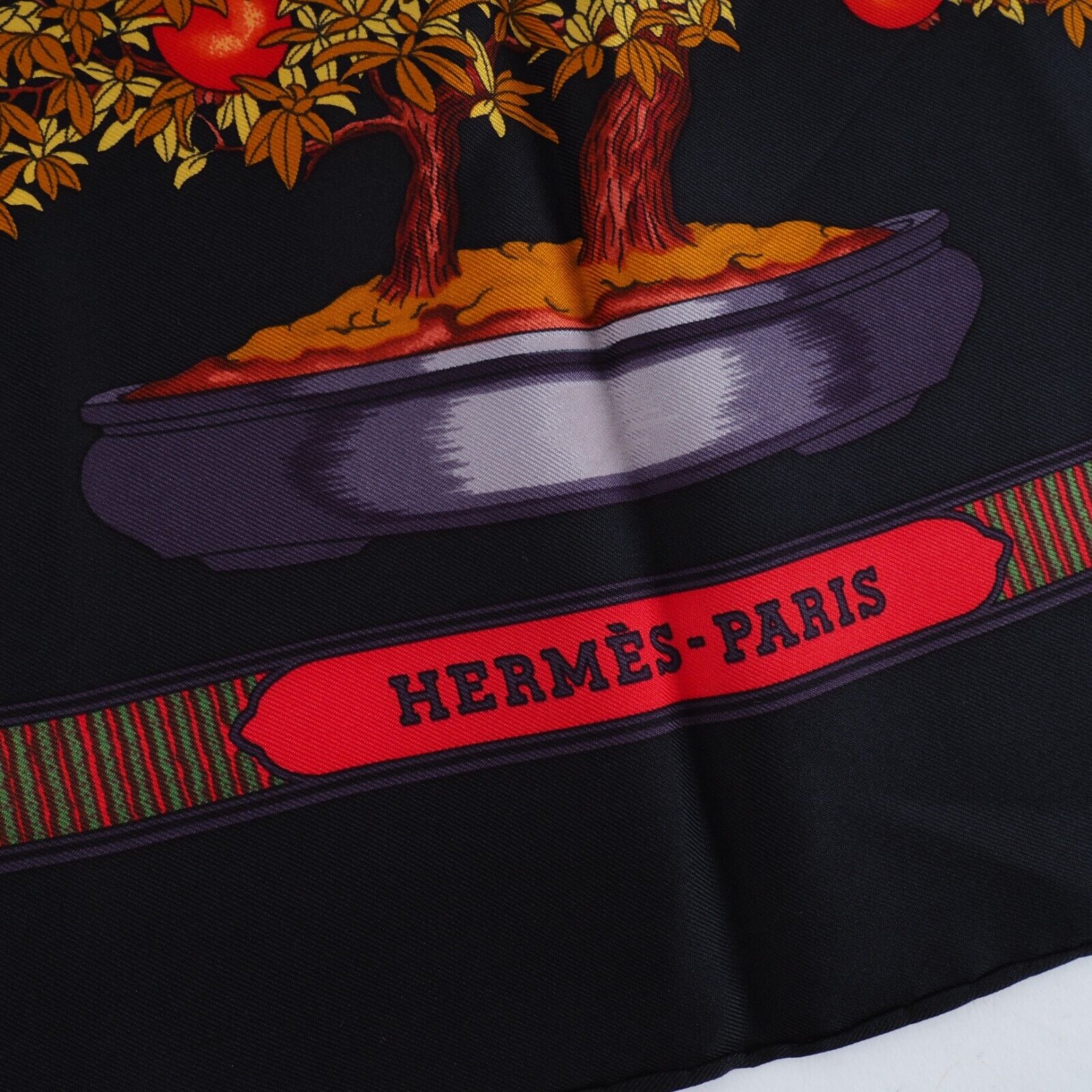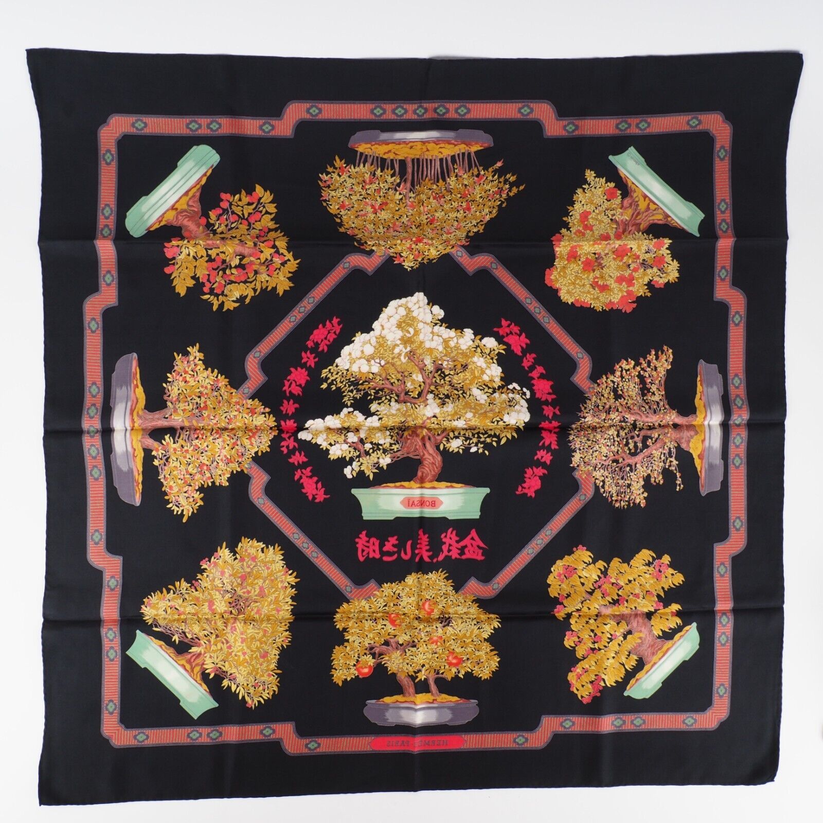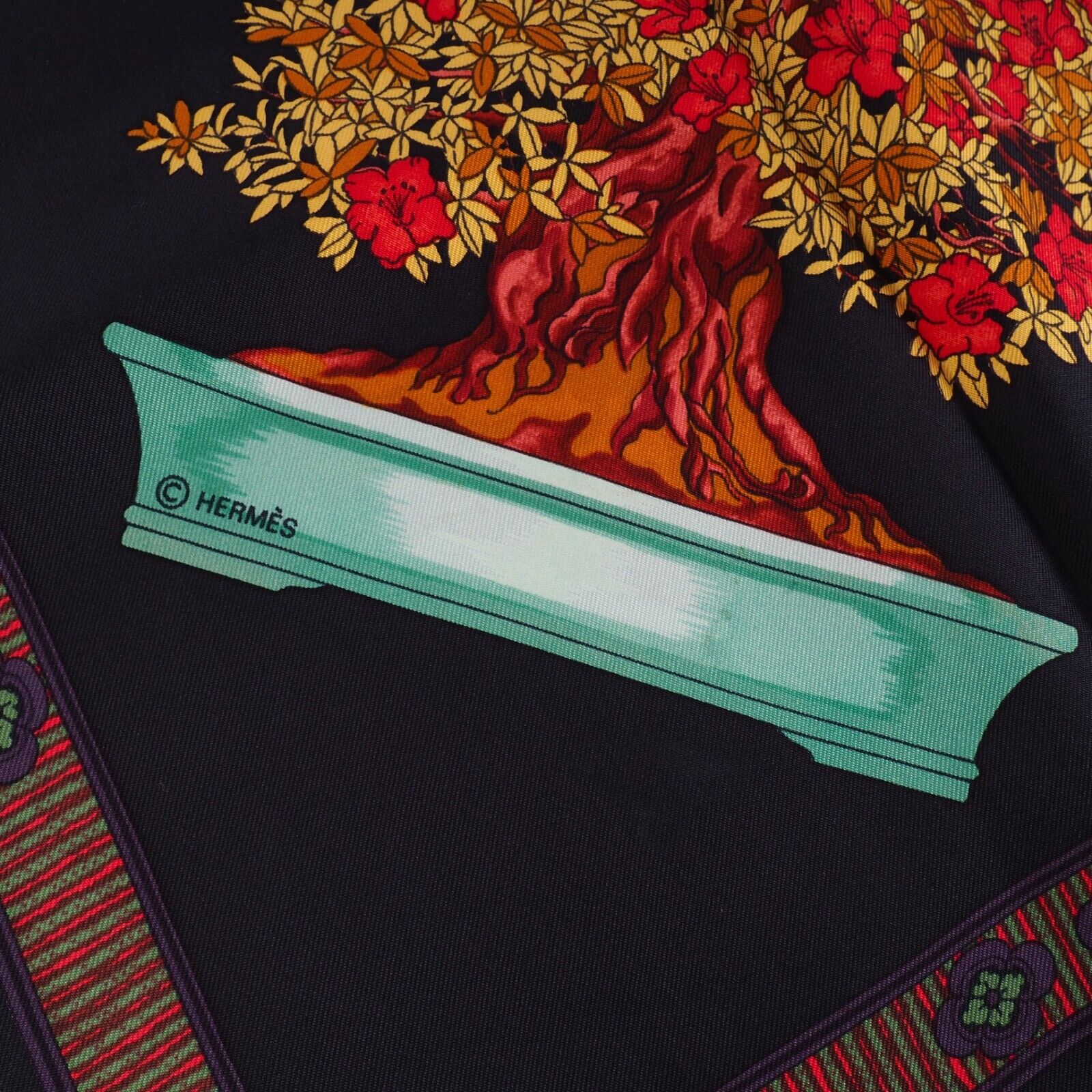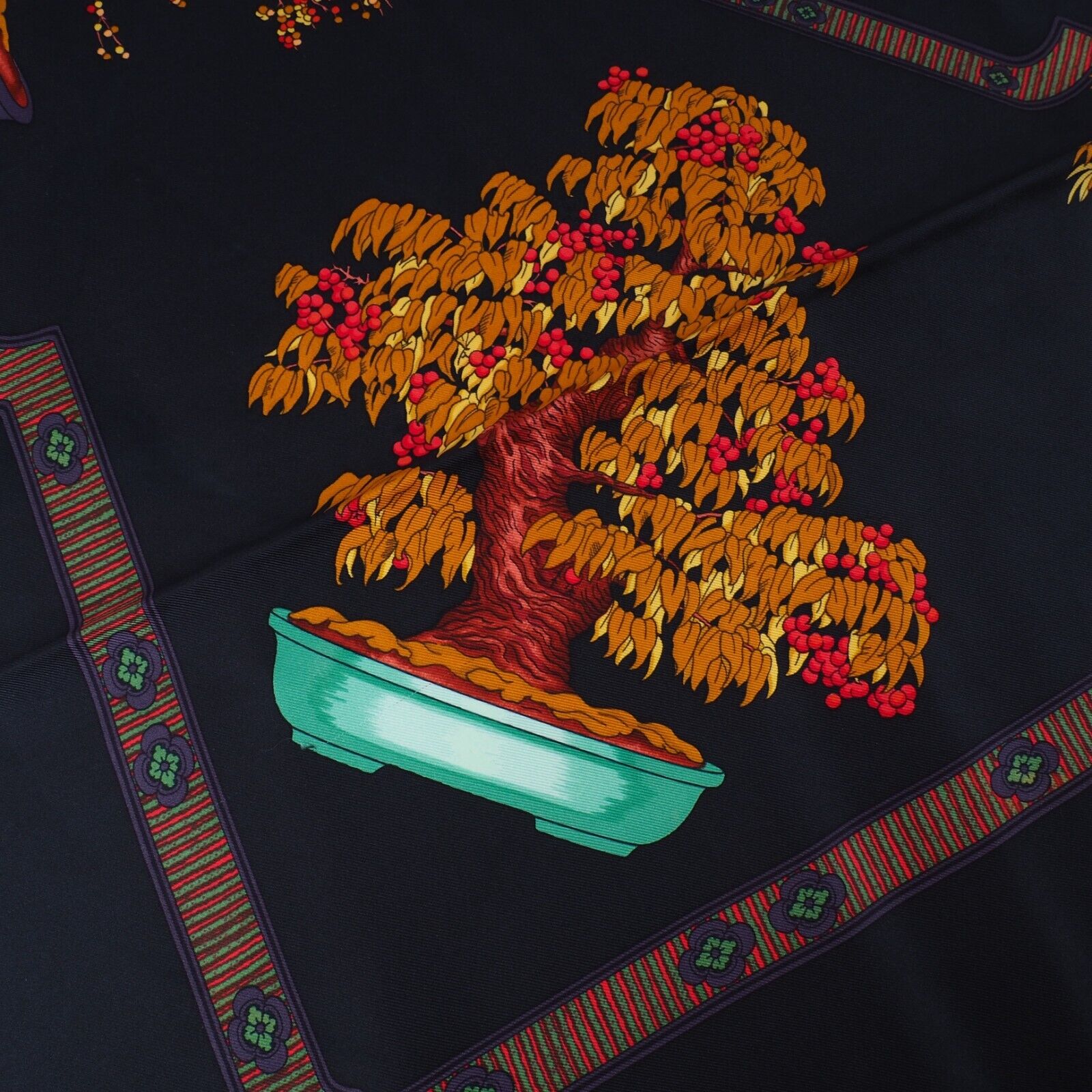 Diese wunderschöne Seidencarré „Les beaux jours des Bonsai“ von Hermes wurde aus 100% reine Seide in Frankreich handgefertigt. Erstausgabe von Catherine Baschet 1991. Größe: 90×90.