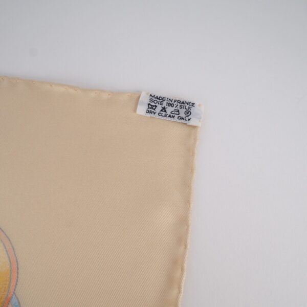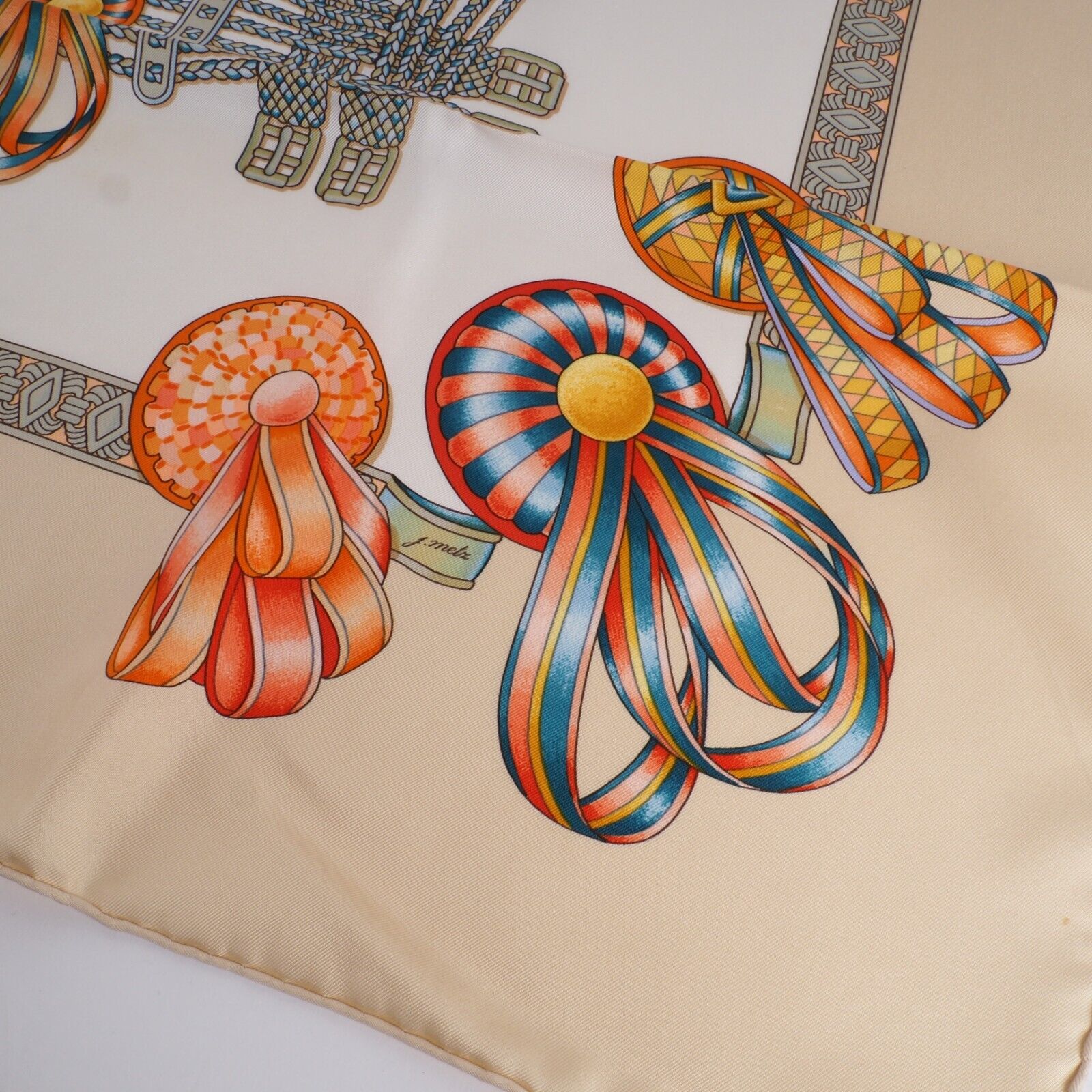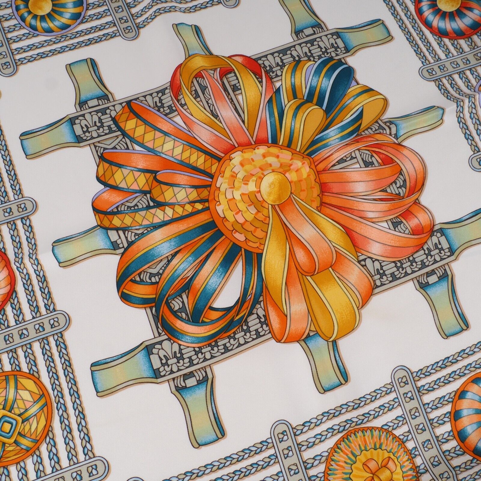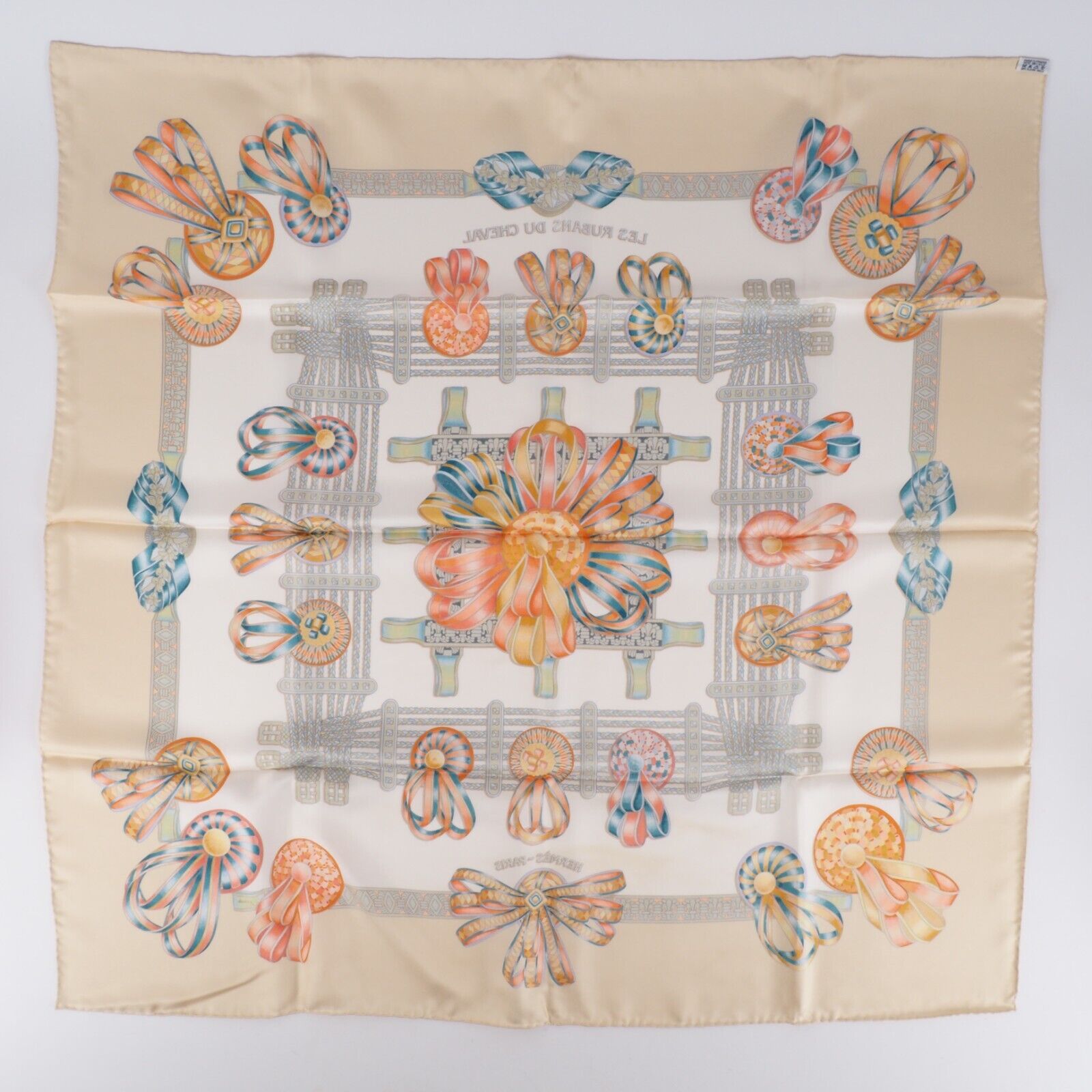 Diese wunderschöne Seidencarré Les Rubans de Cheval“ von Hermes wurde aus 100% reine Seide in Frankreich handgefertigt. Re-Edition von Joachim Metz 00-er Jahren. Größe: 90×90.