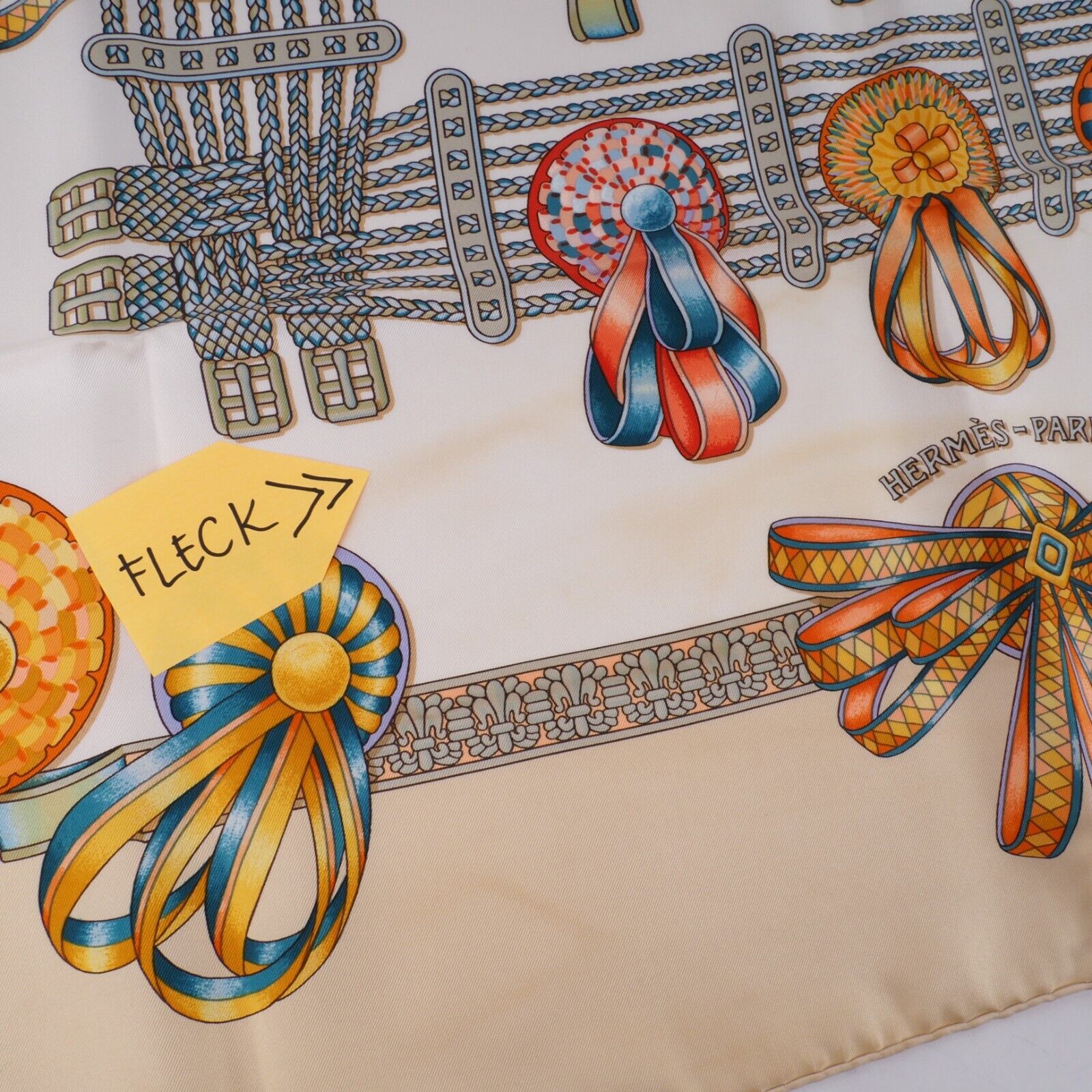 Diese wunderschöne Seidencarré Les Rubans de Cheval" von Hermes wurde aus 100% reine Seide in Frankreich handgefertigt. Re-Edition von Joachim Metz 00-er Jahren. Größe: 90x90. Mit leichten hellbraunen Flecken siehe Bild - mit Karton. Keine Fadenzieher und Gerüche.