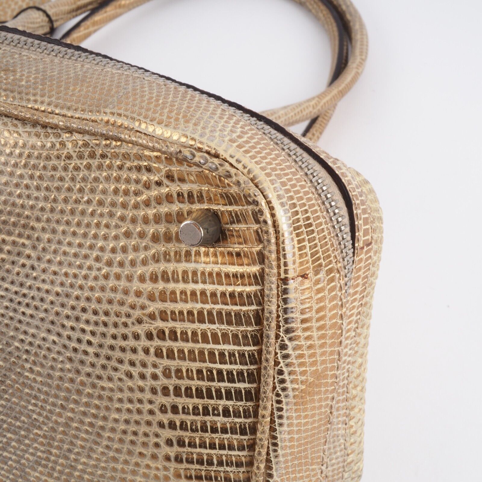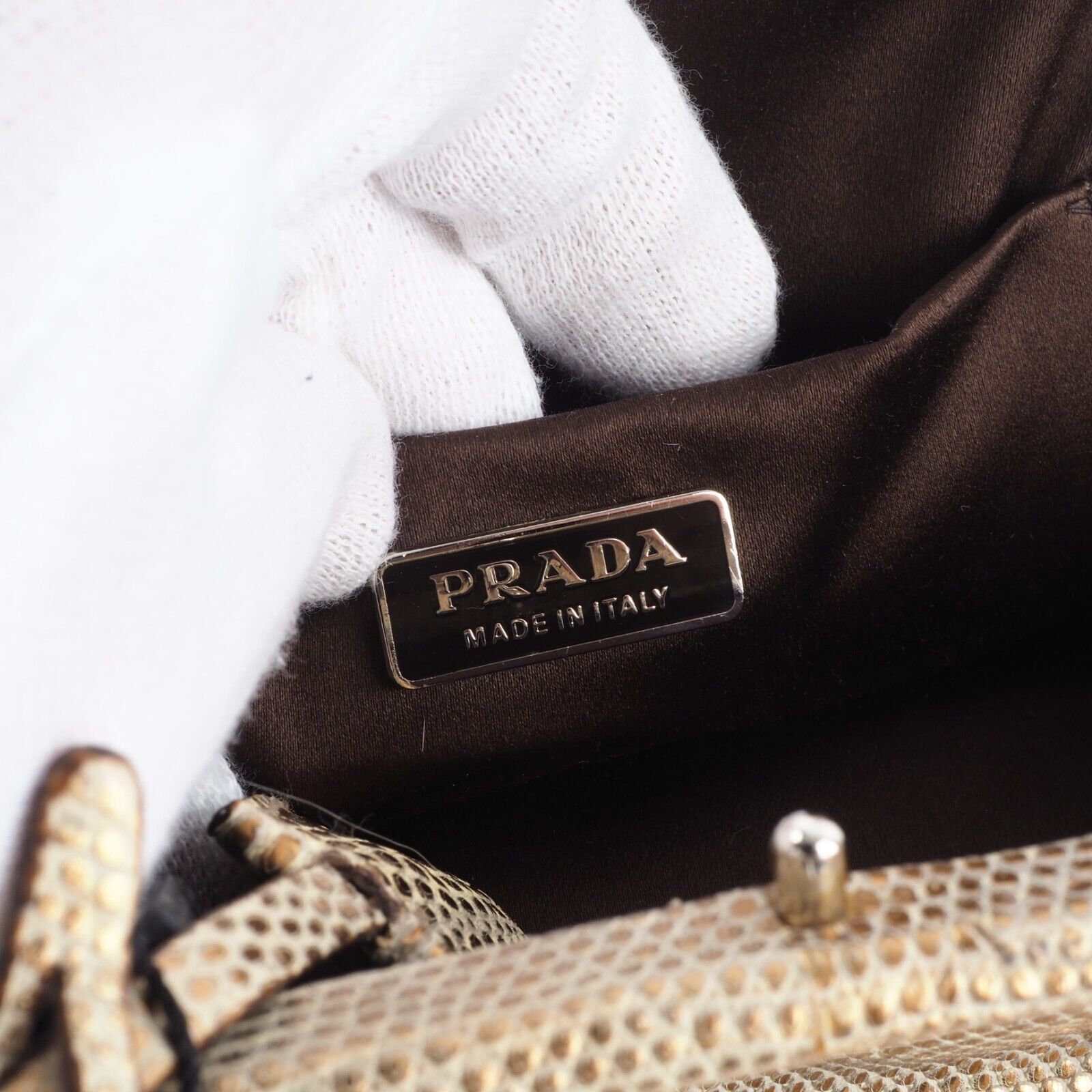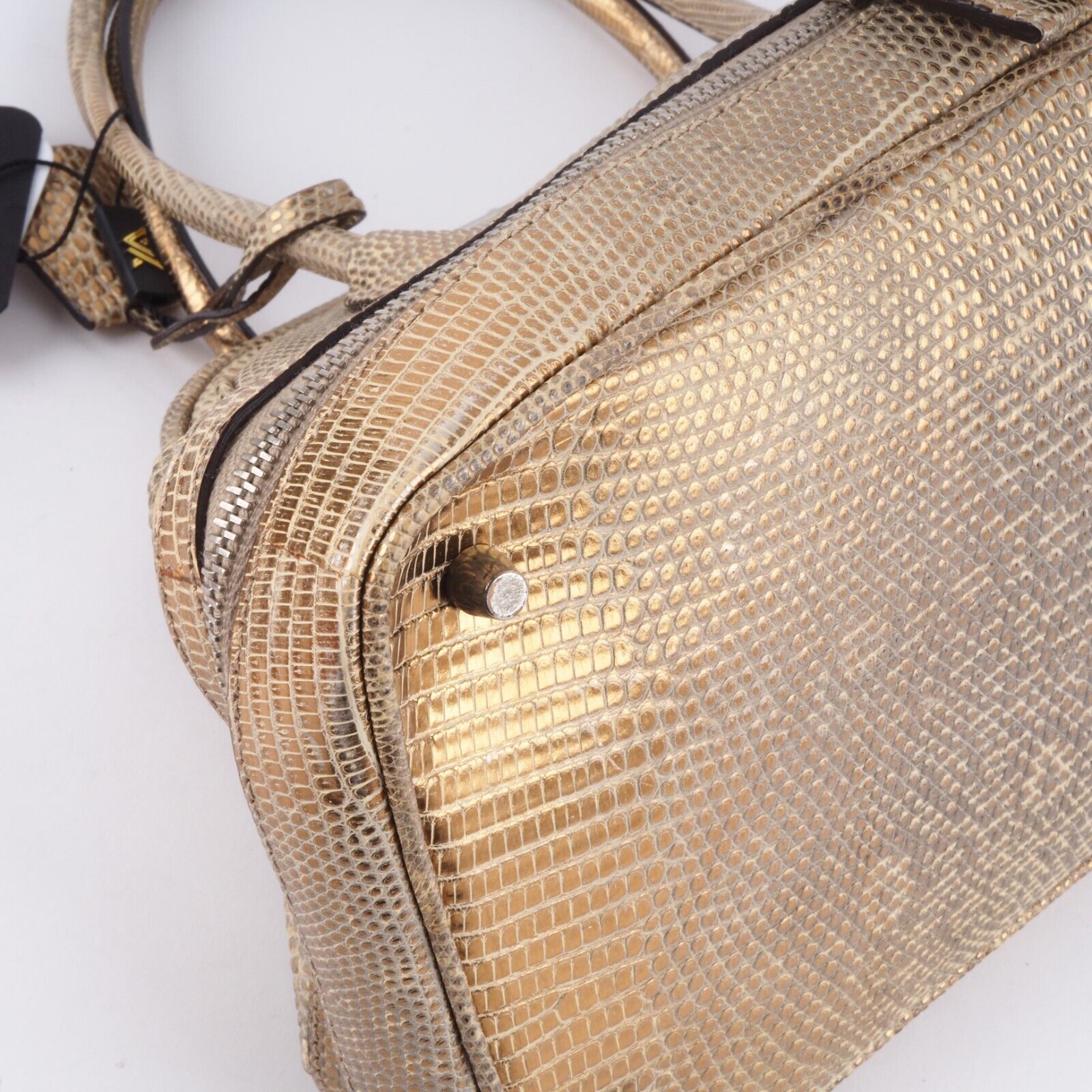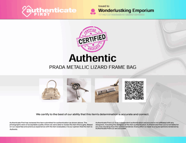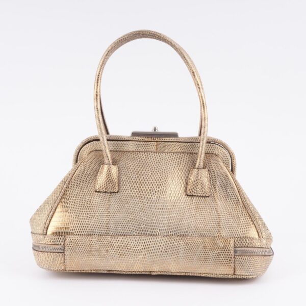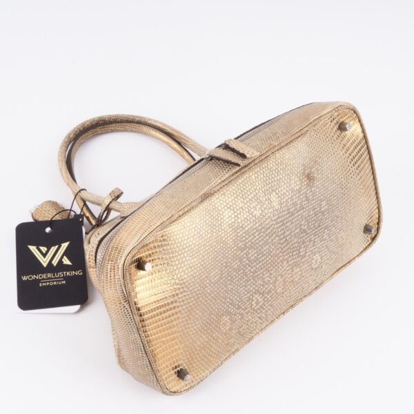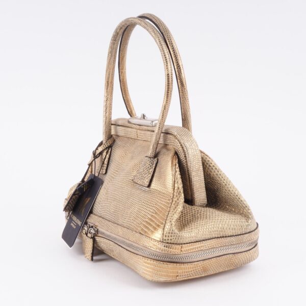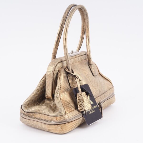 Diese wunderschöne seltene Mini Arzttasche von PRADA wurde am Anfang 2000-er Jahren in Italien aus hochwertigem Echsenleder in Goldtone handgefertigt. Die Tasche wurde so gut wie nie benutzt. Es gibt einen Fleck am Taschenboden – siehe Bilder und leiche haarfein Kratzer an der silberne Hardware. Sonst ist die Tasche neuwertig Innen und außen absolut sauber und frei von Gerüche. Mit einem Reißverschlussfach unten und Innenfach mit Innenfutter aus feinem Satin. Kommt mit Staubbeutel und Echtheitszertifikat.