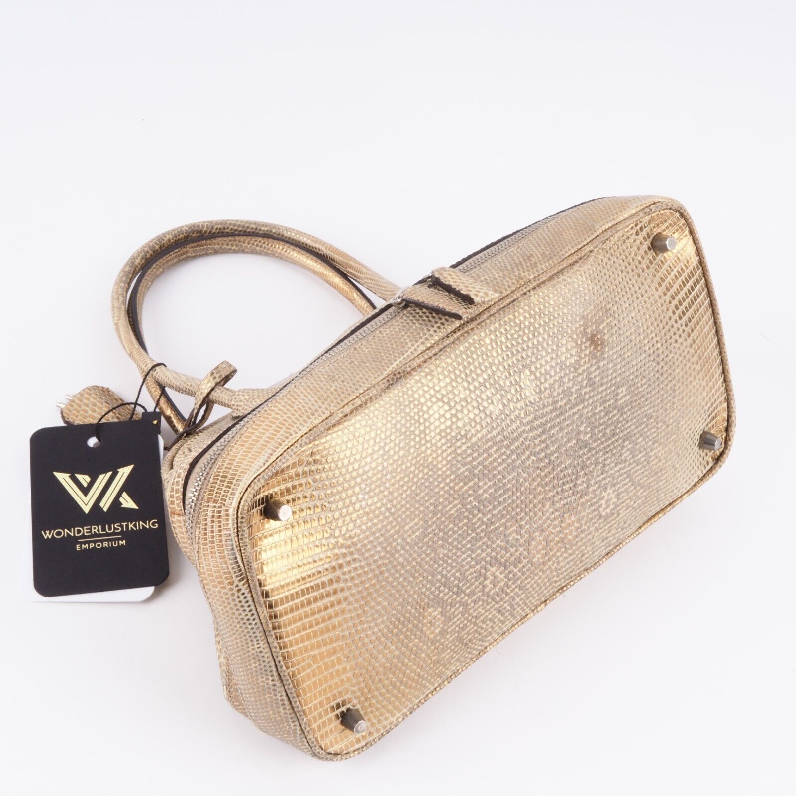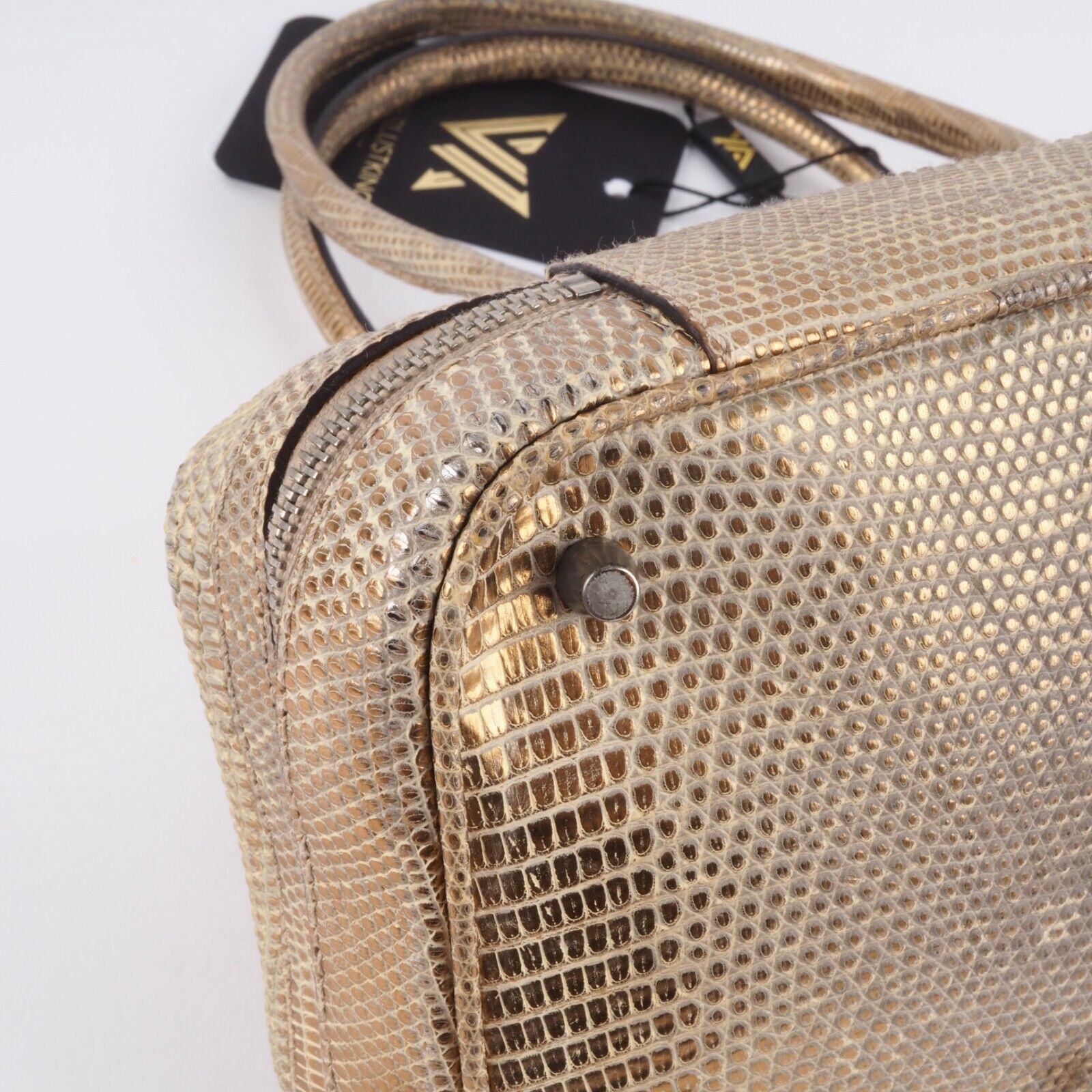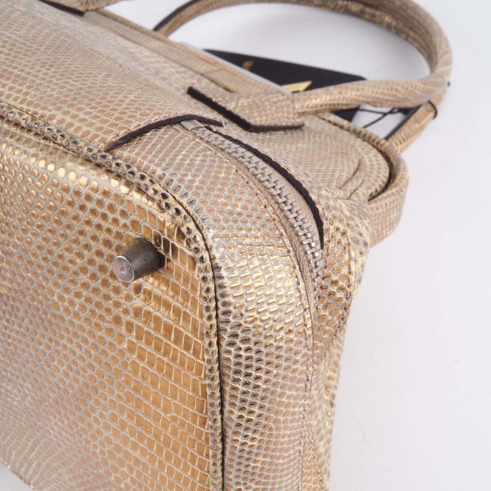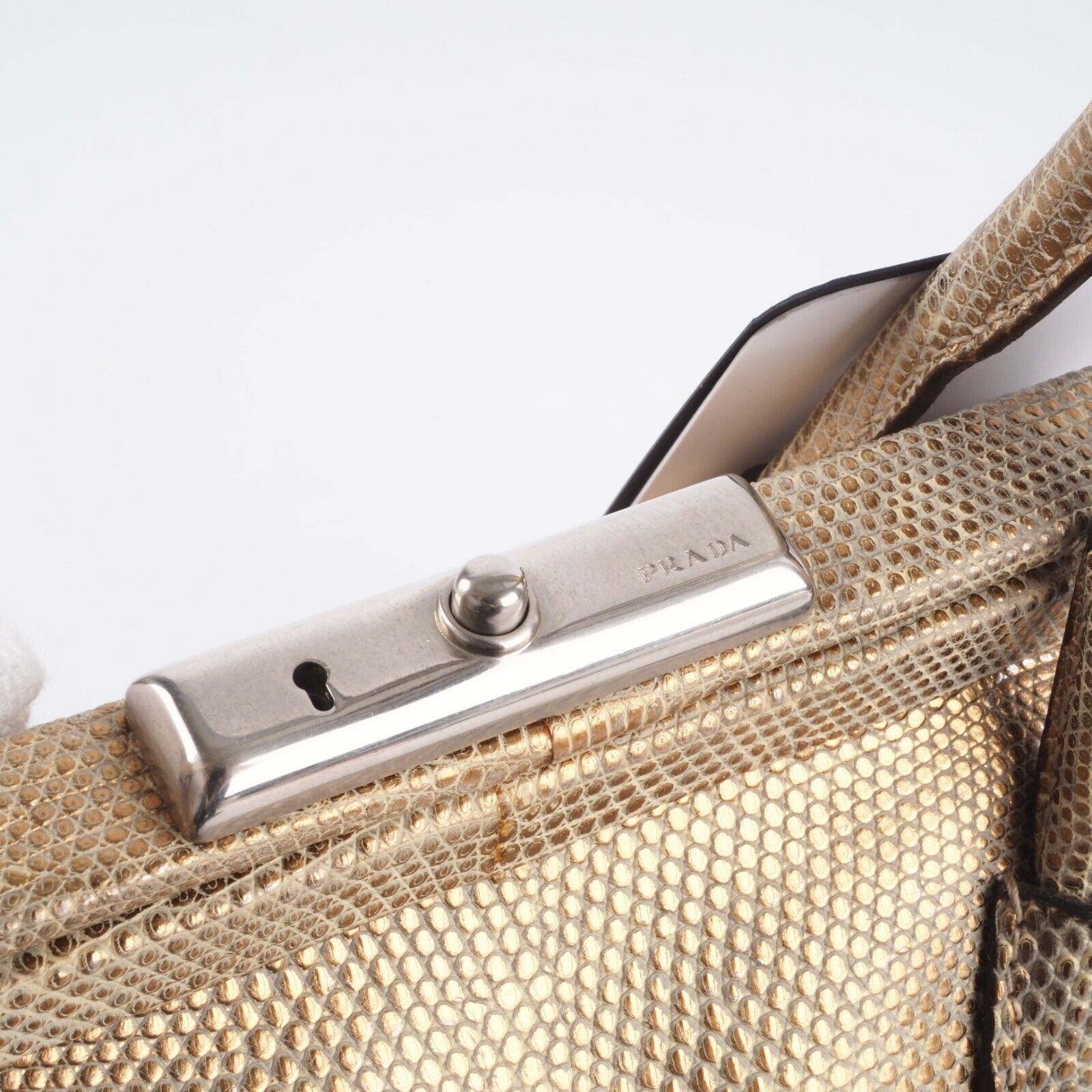 Diese wunderschöne seltene Mini Arzttasche von PRADA wurde am Anfang 2000-er Jahren in Italien aus hochwertigem Echsenleder in Goldtone handgefertigt. Die Tasche wurde so gut wie nie benutzt. Es gibt einen Fleck am Taschenboden – siehe Bilder und leiche haarfein Kratzer an der silberne Hardware. Sonst ist die Tasche neuwertig Innen und außen absolut sauber und frei von Gerüche. Mit einem Reißverschlussfach unten und Innenfach mit Innenfutter aus feinem Satin. Kommt mit Staubbeutel und Echtheitszertifikat.