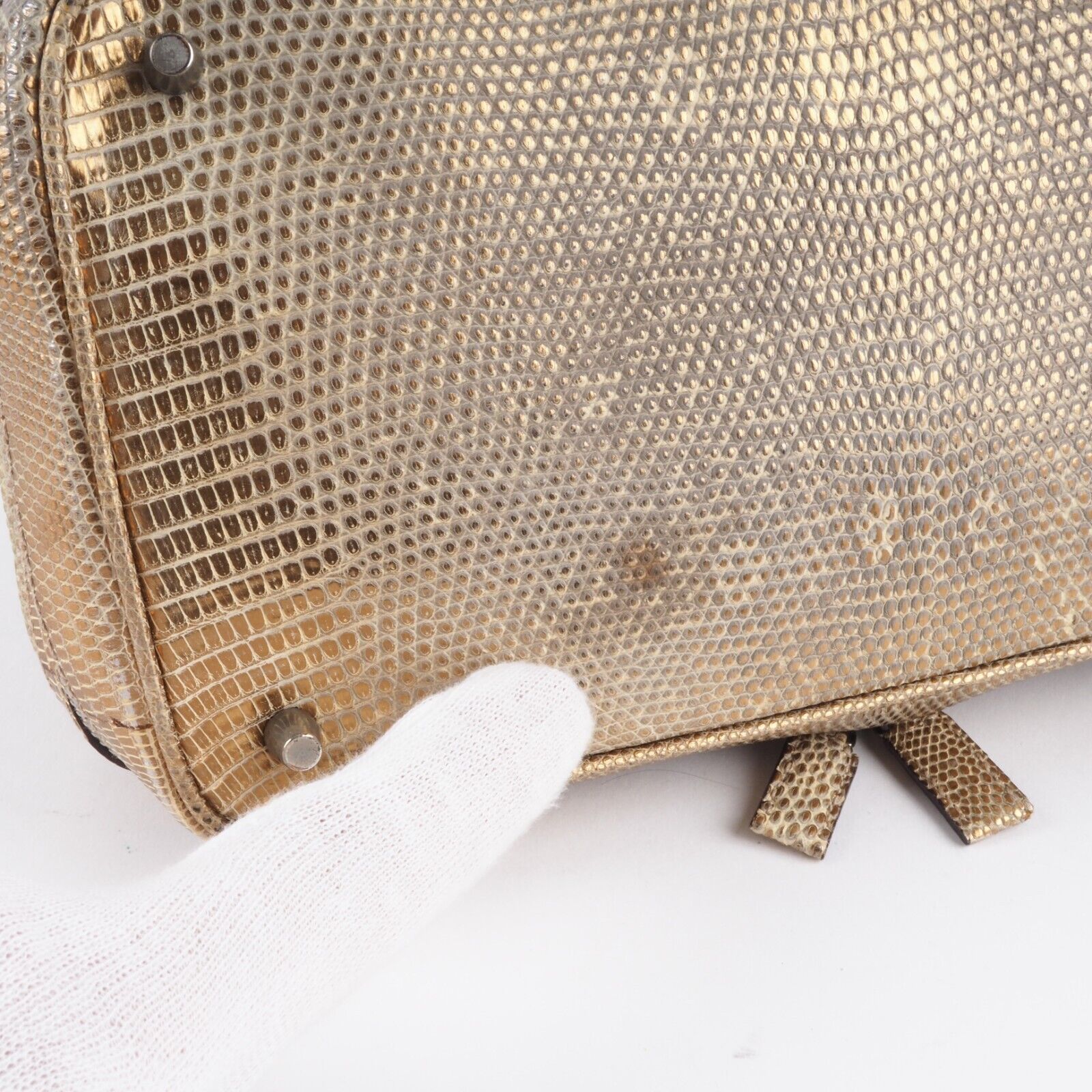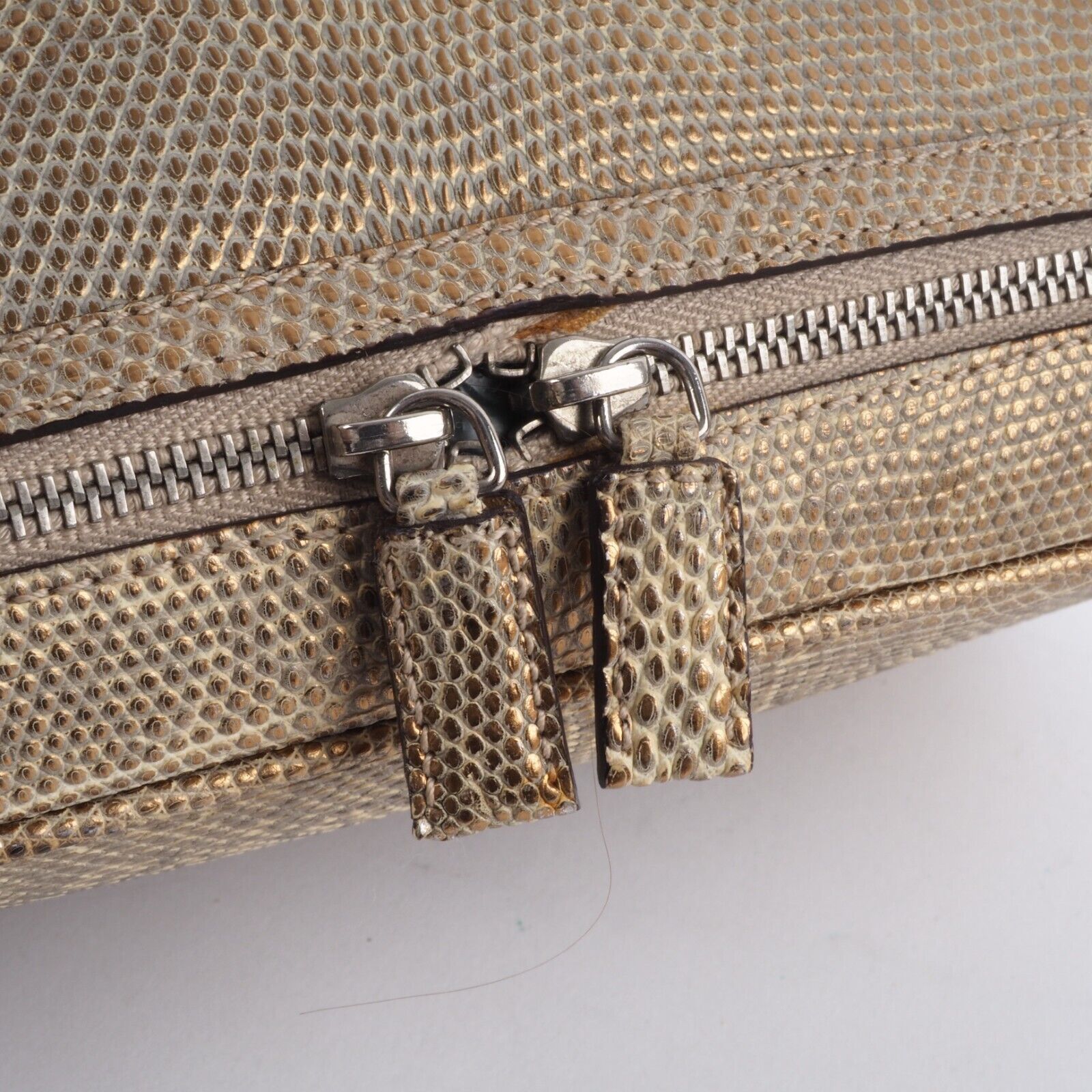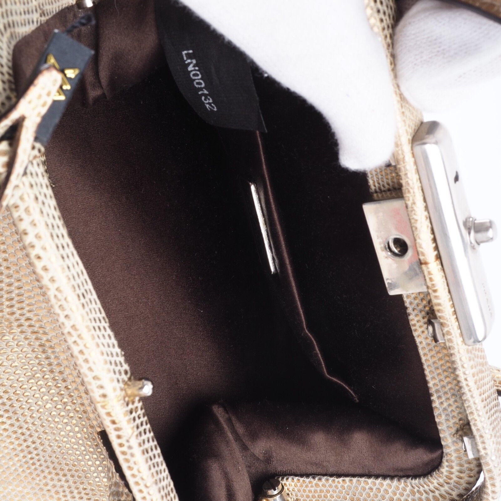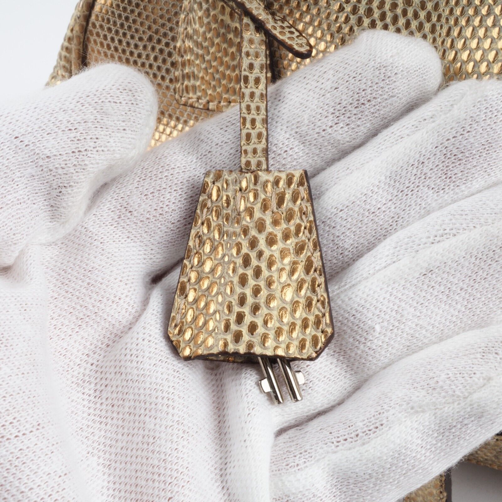 Diese wunderschöne seltene Mini Arzttasche von PRADA wurde am Anfang 2000-er Jahren in Italien aus hochwertigem Echsenleder in Goldtone handgefertigt. Die Tasche wurde so gut wie nie benutzt. Es gibt einen Fleck am Taschenboden – siehe Bilder und leiche haarfein Kratzer an der silberne Hardware. Sonst ist die Tasche neuwertig Innen und außen absolut sauber und frei von Gerüche. Mit einem Reißverschlussfach unten und Innenfach mit Innenfutter aus feinem Satin. Kommt mit Staubbeutel und Echtheitszertifikat.