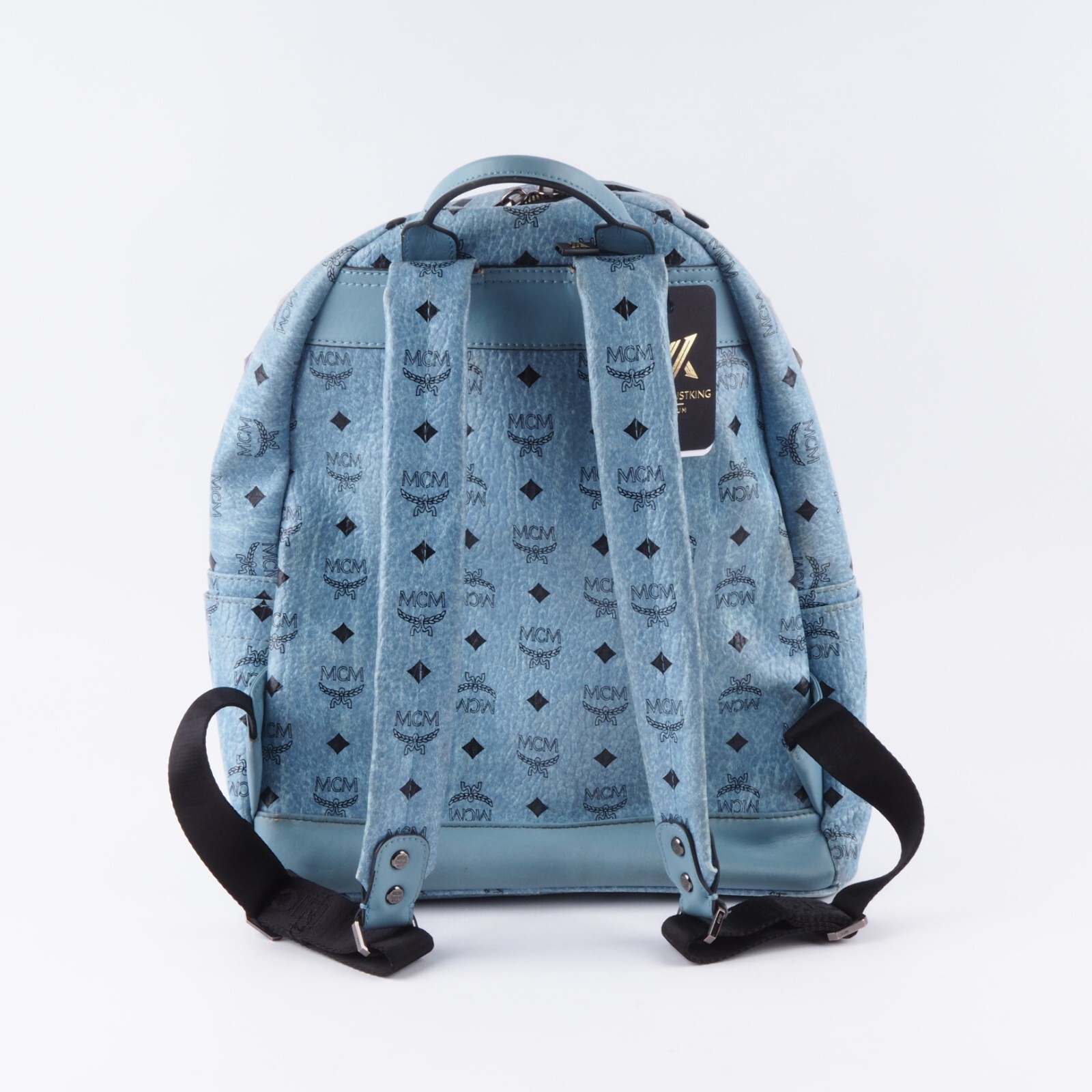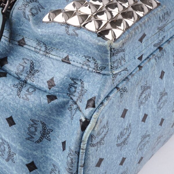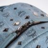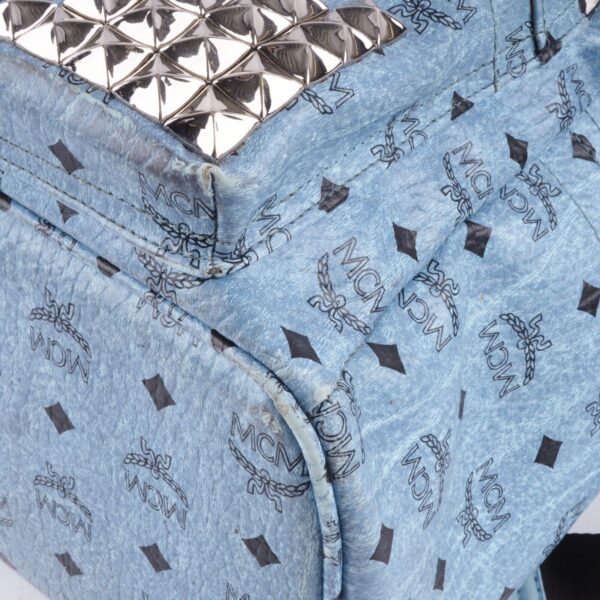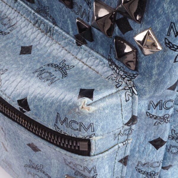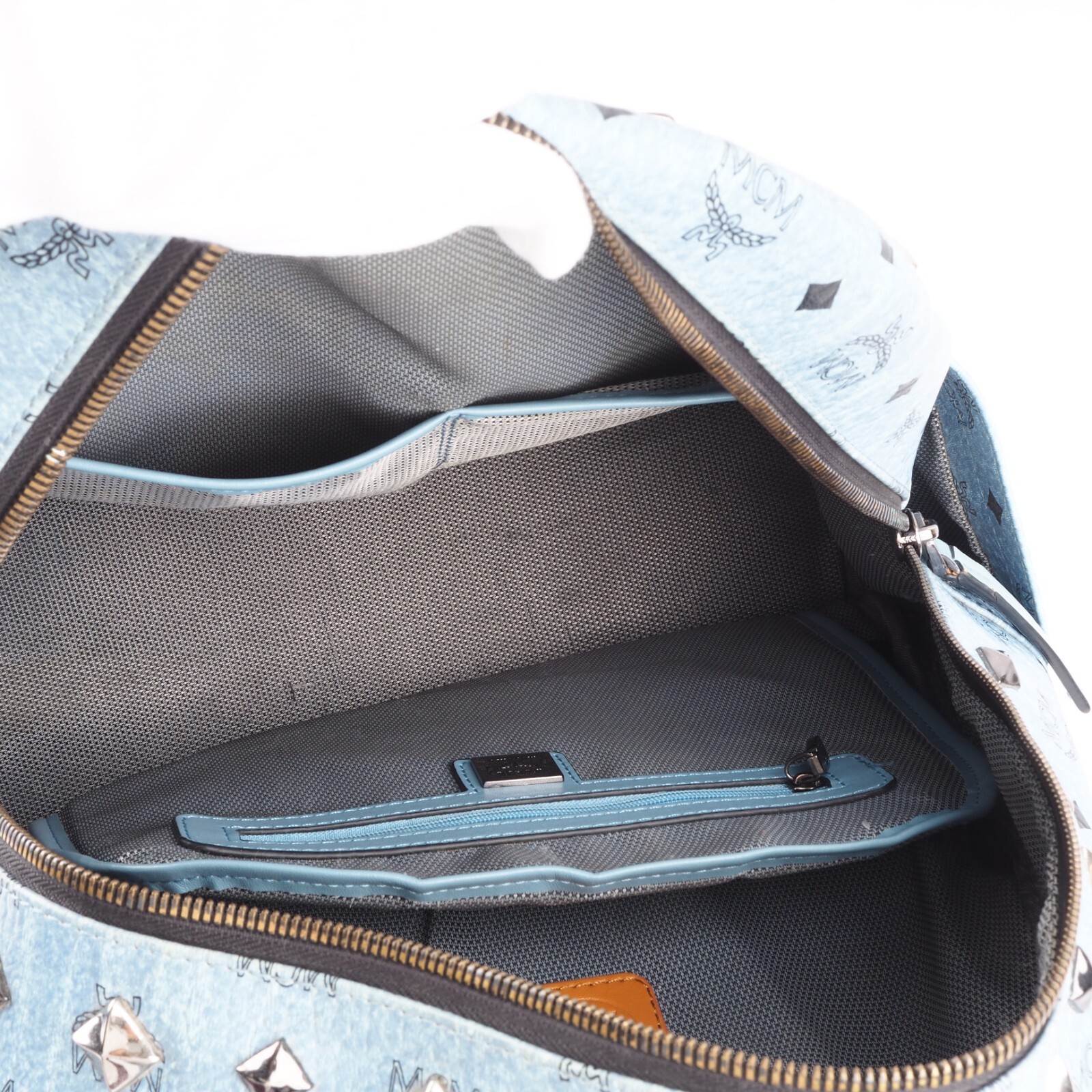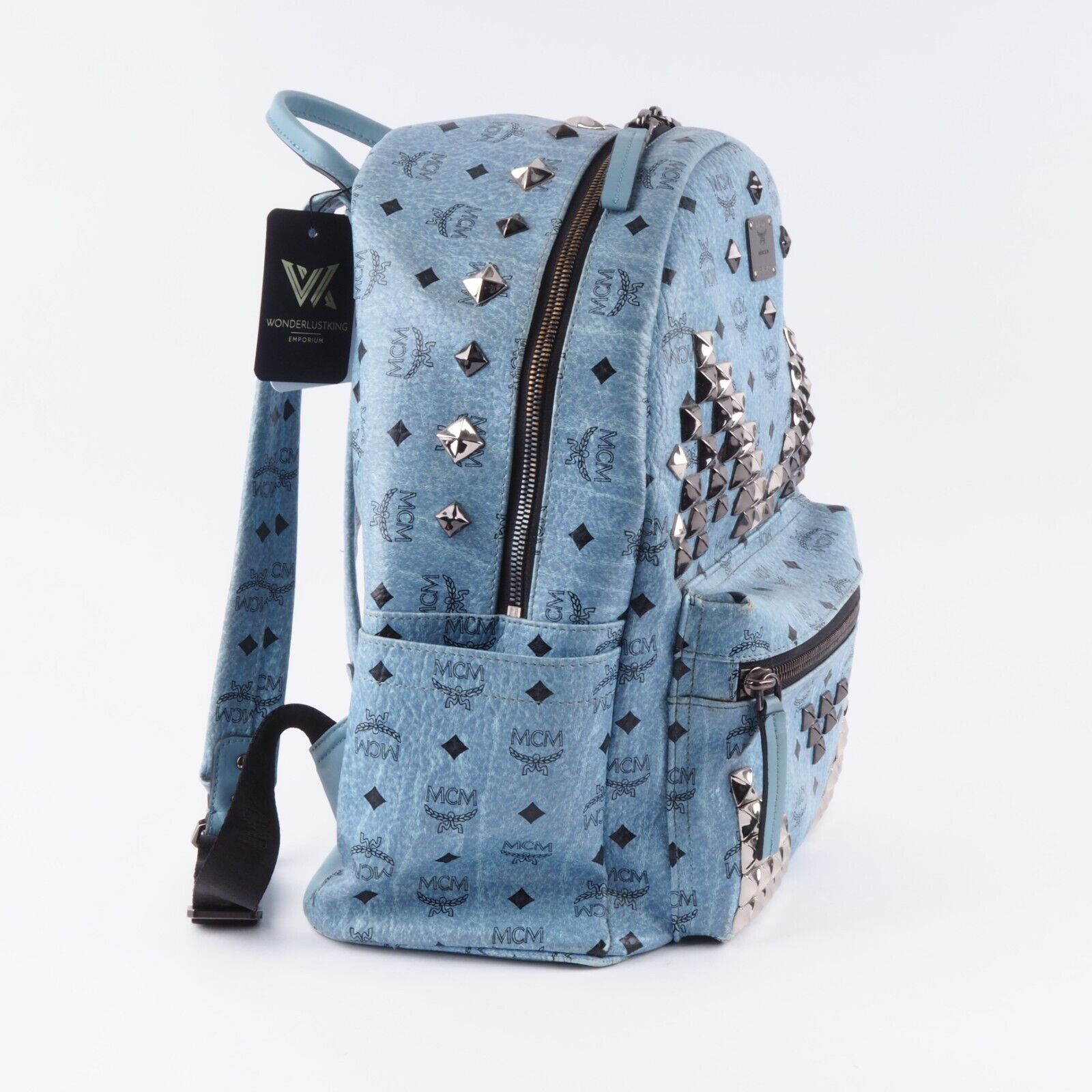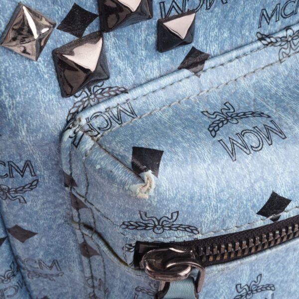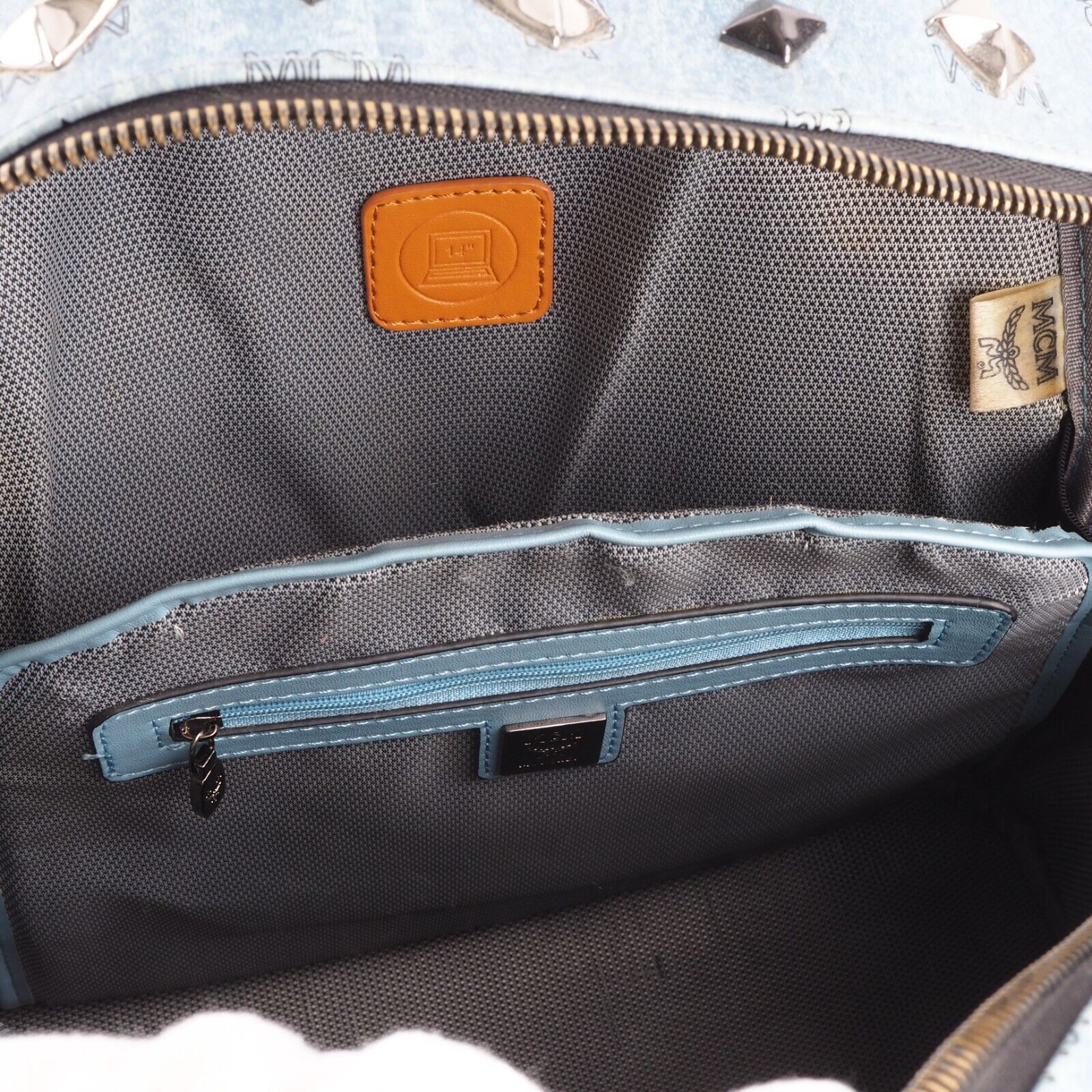Diese stylische seltene Stark Rucksack bon MCM in distressed Hellblau mit silbernen Nieten ist in gebrauchtem Zustand mit einige Falten, Abreibungen siehe Bilder. Der Rucksack ist geräumig und sehr praktisch. Zwei Seitenfächer außen für zB Trinkflaschen. Eine Außentasche mit Reißverschluss. 3 Innenfächer, davon eine mit Reißverschluss. + Ein großes Innenfach für Notebooks bis zu 14″ größe. Der Rucksack ist für Herren gedacht von der größe her, aber steht für Frauen auch gut, wenn man größere Rucksäcke mag.