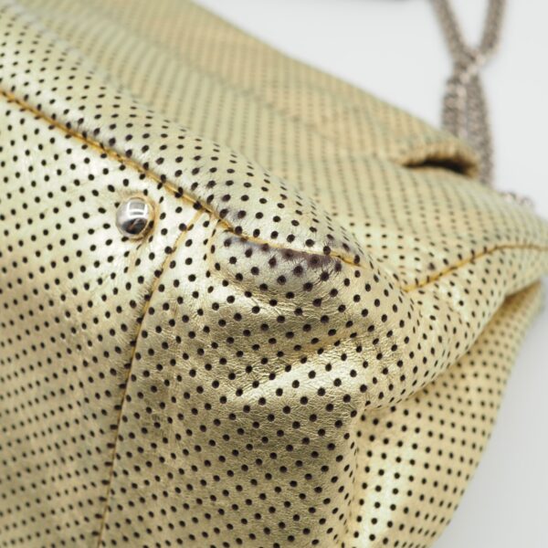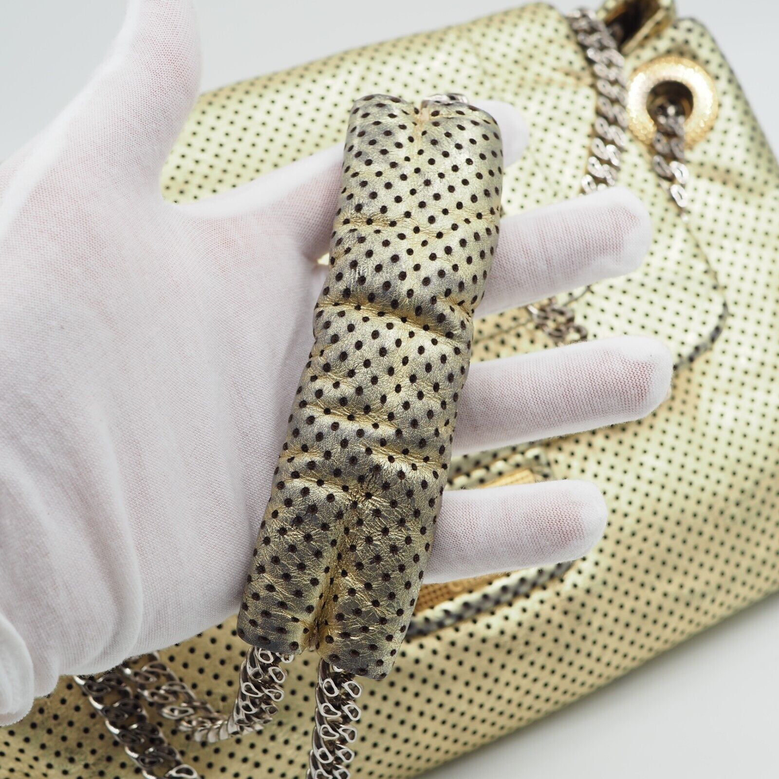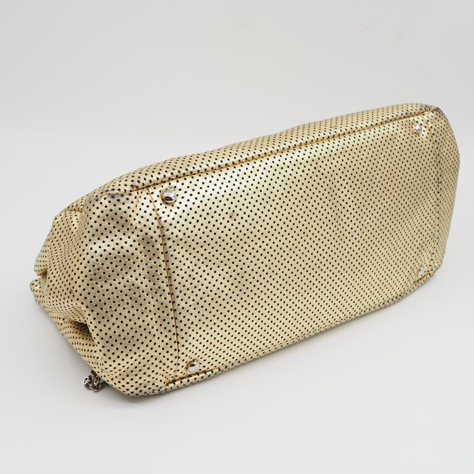 Diese seltene stylische Akkordeon Drill Perforated Schultertasche von CHANEL wurde aus perforiertem Leder in Italien handgefertigt. Die Goldene Farbe ist sehr selten, und ein bisschen empfindlich. Also Gebrauchspuren wie Farbabreibungen am Schulterkissen und am unteren Ecken sind vorhanden, siehe Bilder. Sonst innen und außen sauber, frei von Gerüche Flecken oder Kratzer. Innenfuter ist aus Satin. Die Schließe funktioniert perfekt. Die Tasche kommt ohne Karte und Staubbeutel. Seriennummer innen lesbar.
