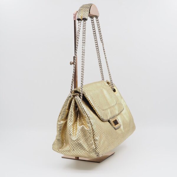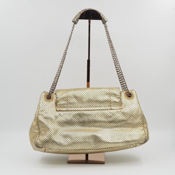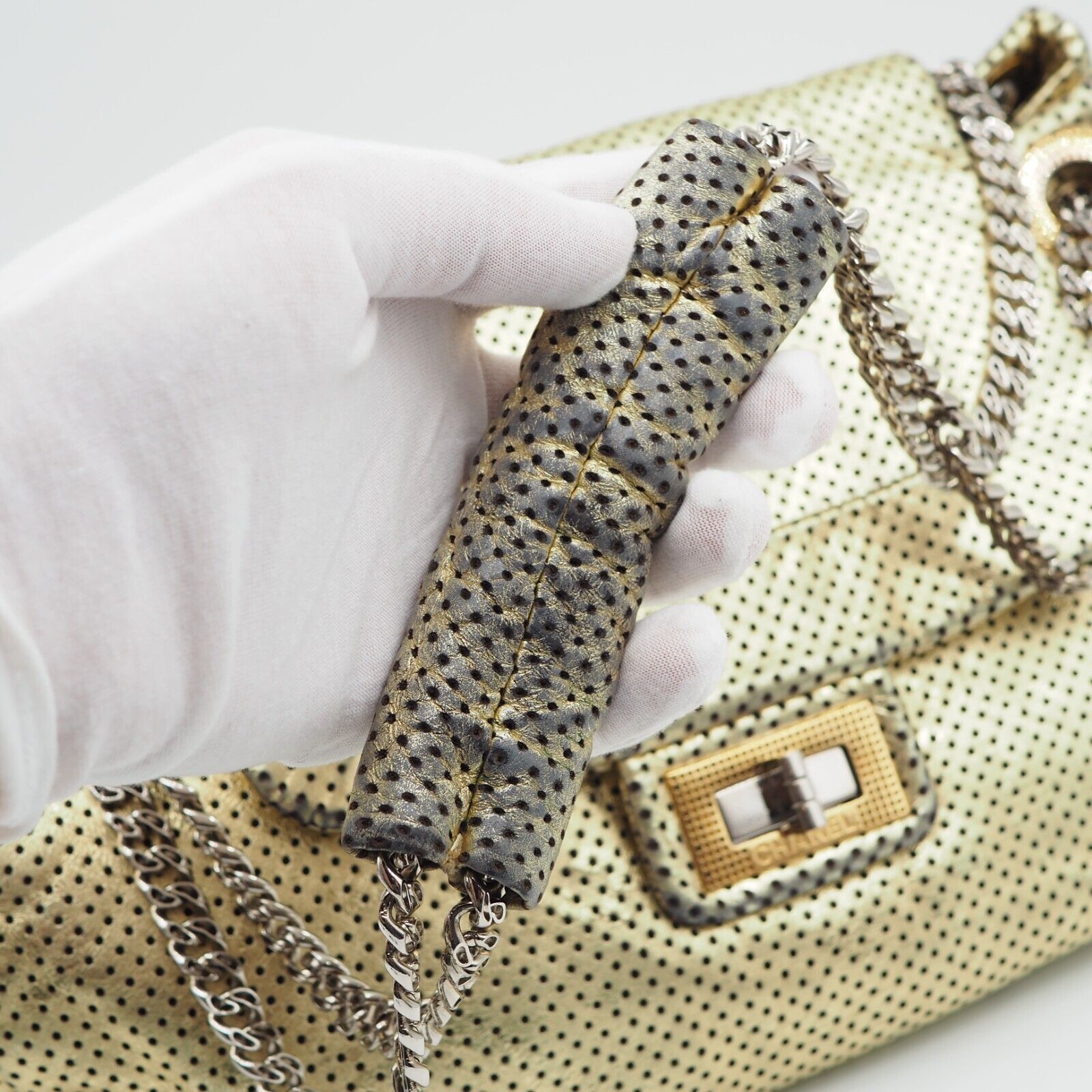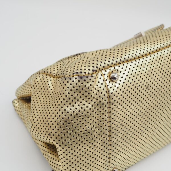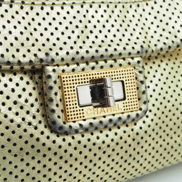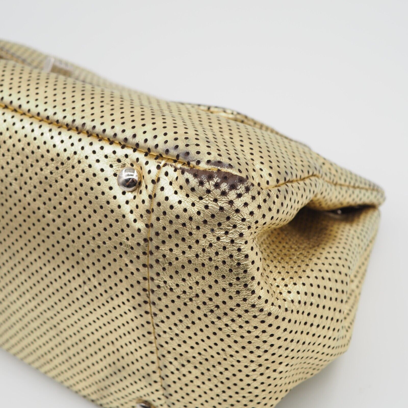 Diese seltene stylische Akkordeon Drill Perforated Schultertasche von CHANEL wurde aus perforiertem Leder in Italien handgefertigt. Die Goldene Farbe ist sehr selten, und ein bisschen empfindlich. Also Gebrauchspuren wie Farbabreibungen am Schulterkissen und am unteren Ecken sind vorhanden, siehe Bilder. Sonst innen und außen sauber, frei von Gerüche Flecken oder Kratzer. Innenfuter ist aus Satin. Die Schließe funktioniert perfekt. Die Tasche kommt ohne Karte und Staubbeutel. Seriennummer innen lesbar.