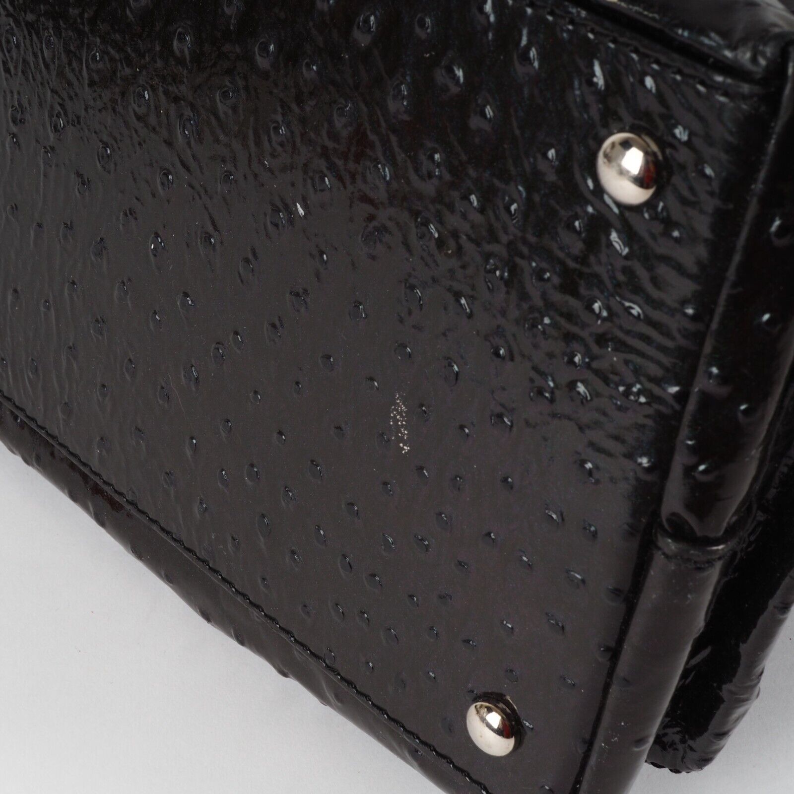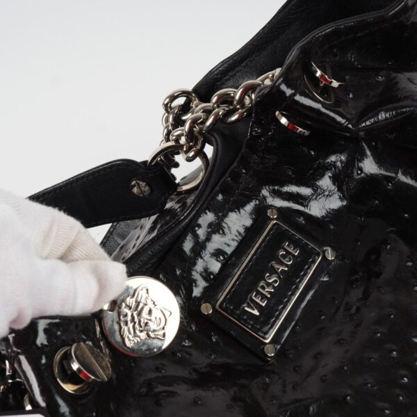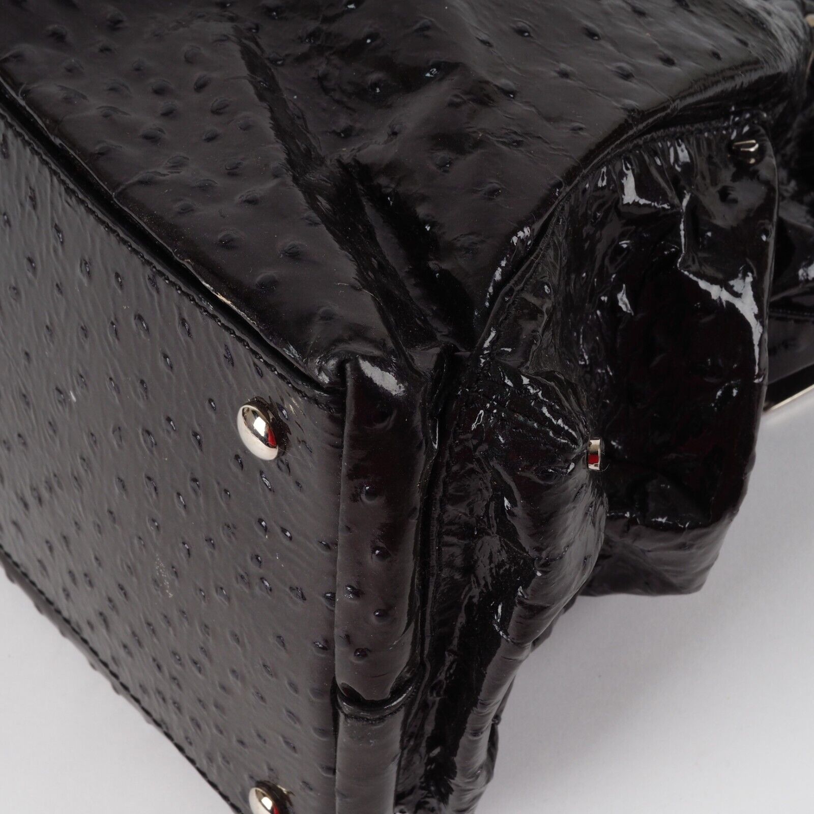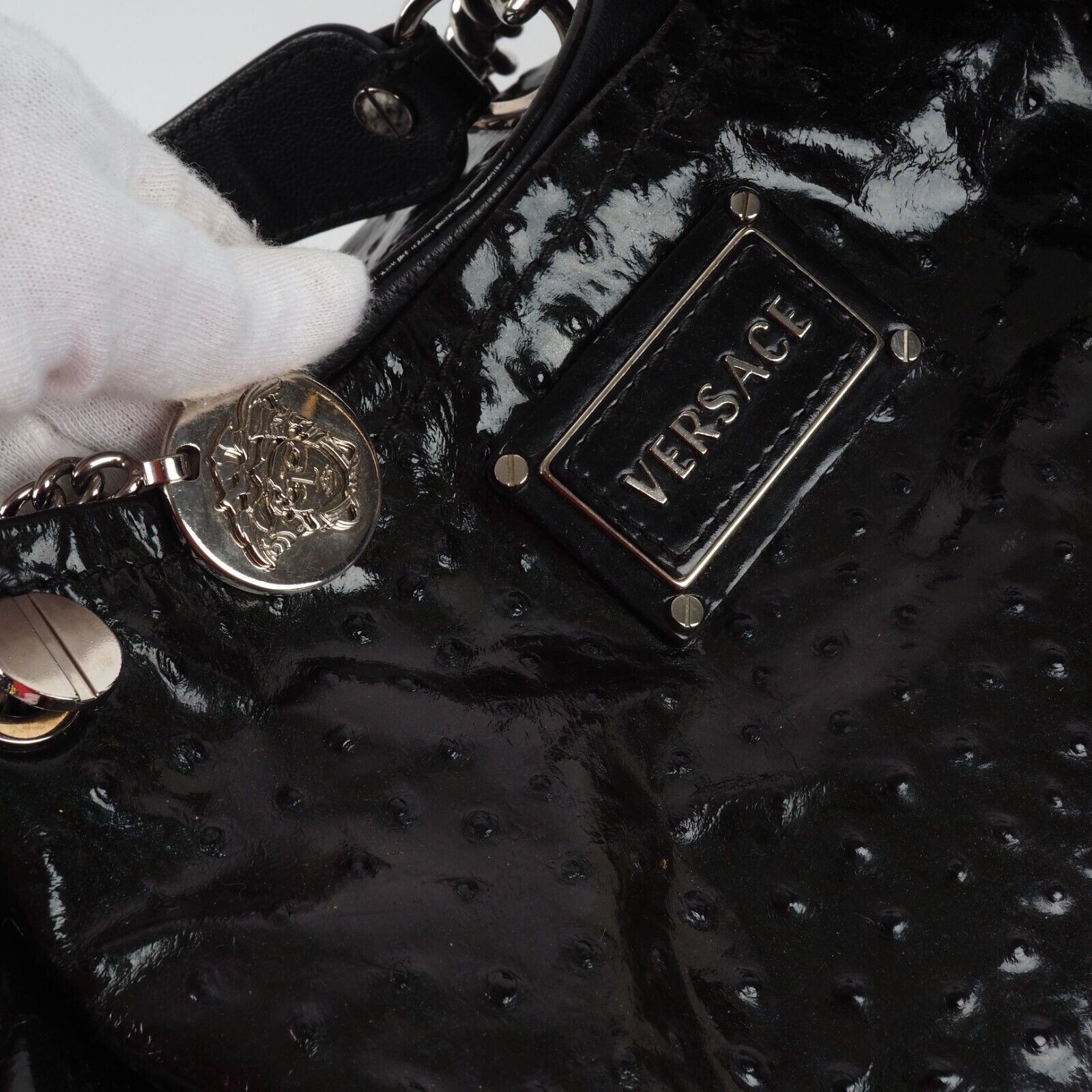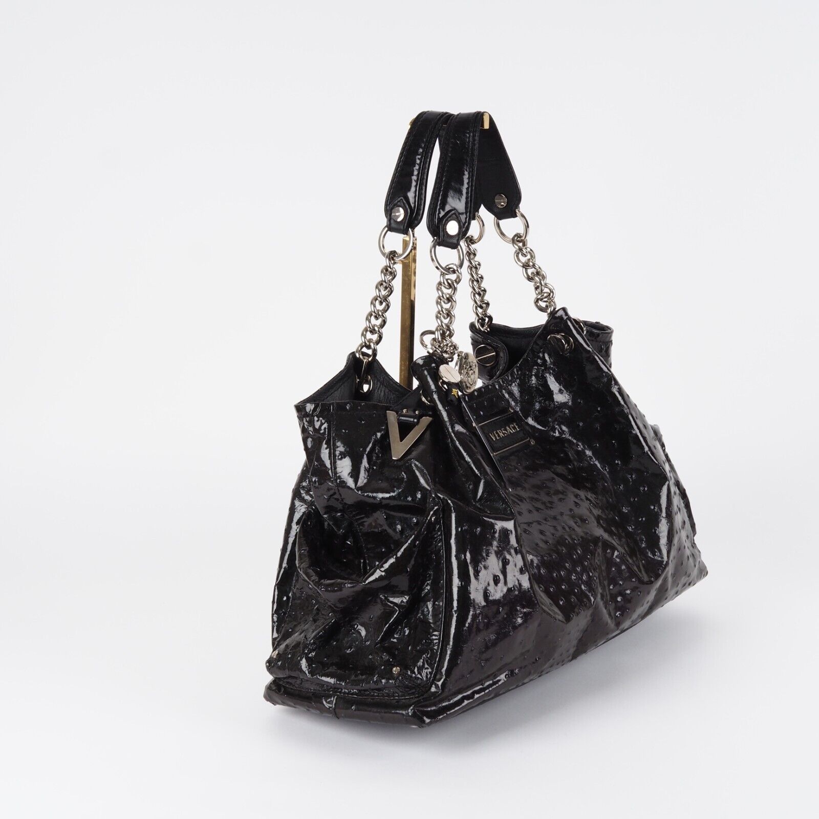 Diese wunderschöne Skarabeo Grüne Lackleder Tote Tasche von Gianni Versace wurde in Italien aus Straußenleder gefertigt.Innenfutter aus Satin. Innen und außen sauber und frei von Gerüche. In gepflegtem Zustand mit leichten Gebrauchspuren.