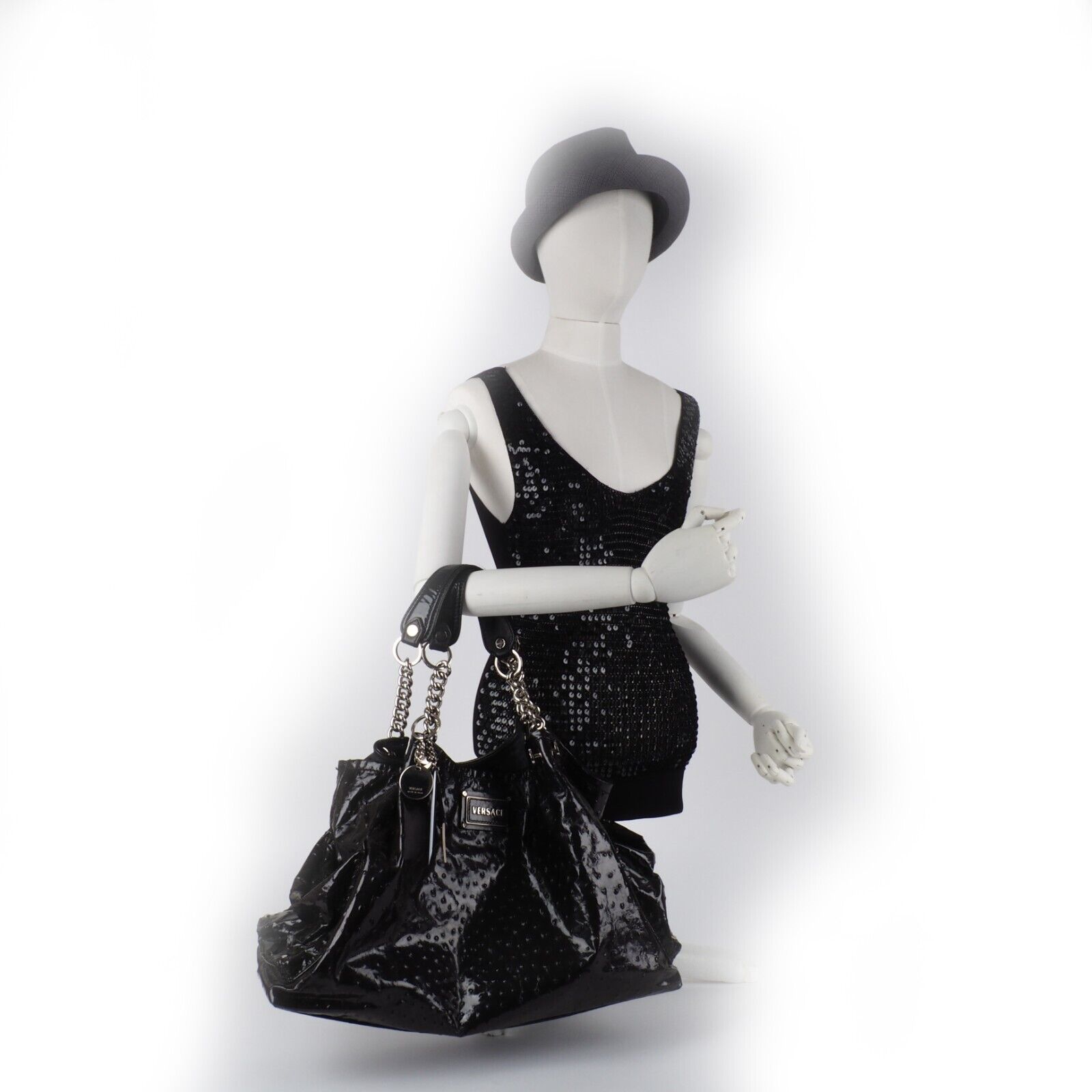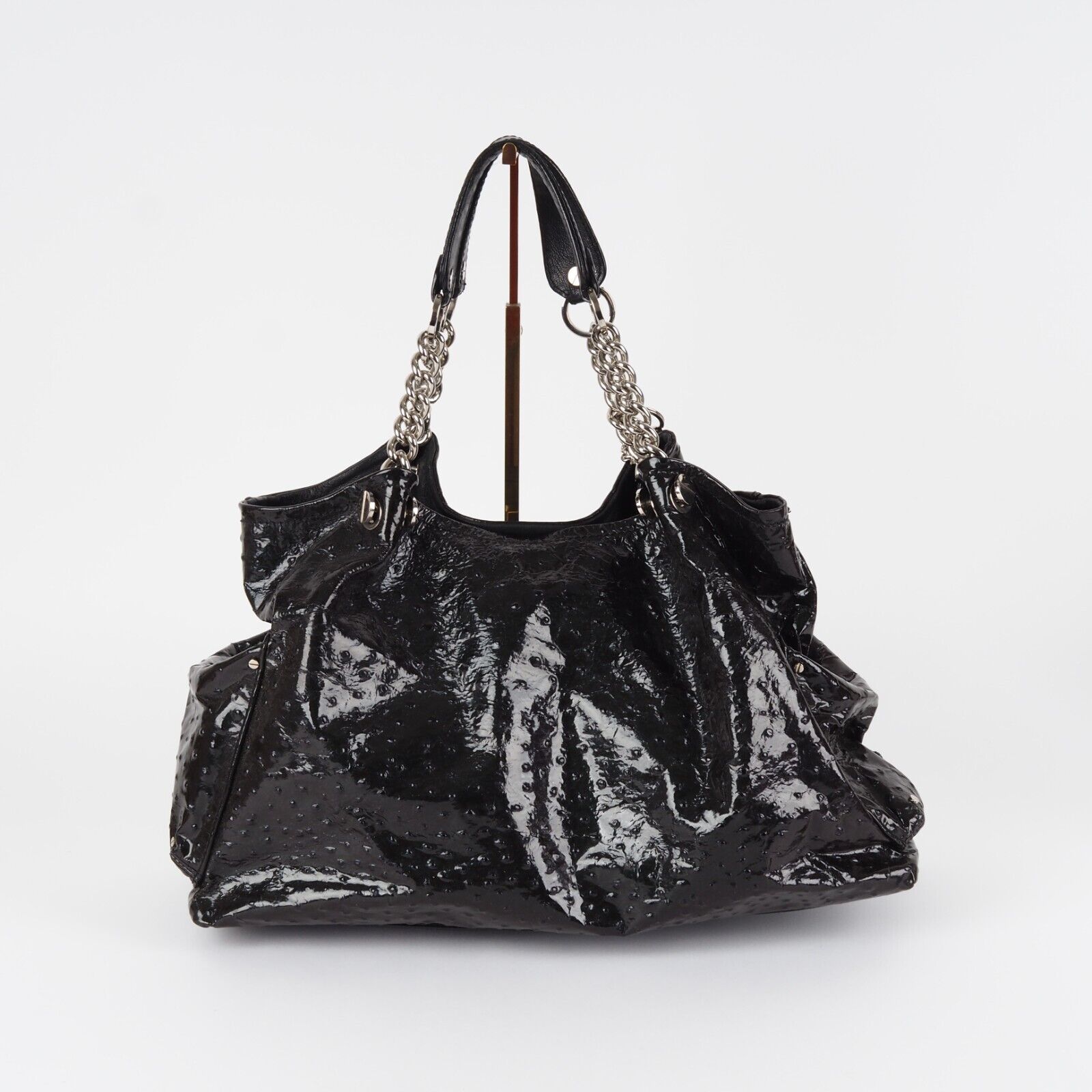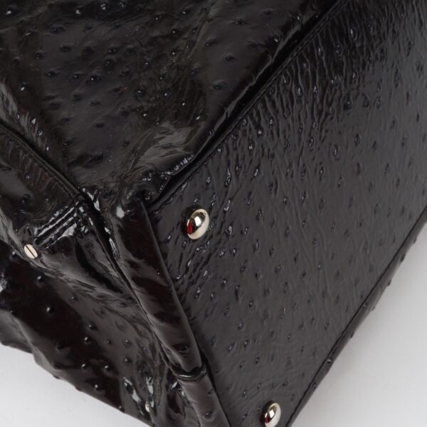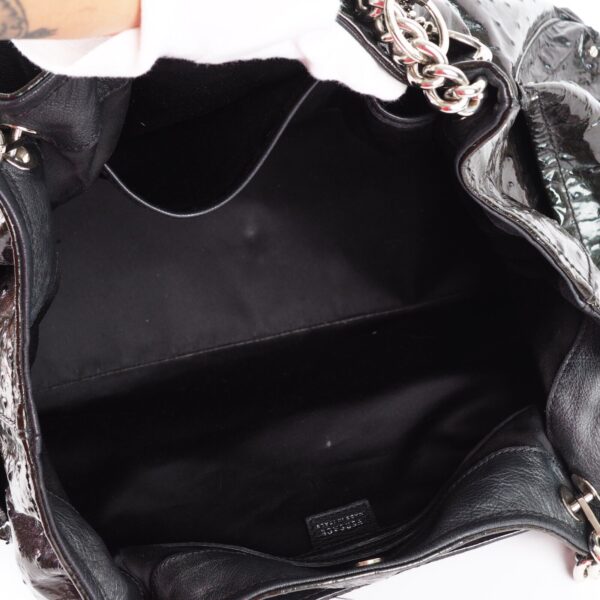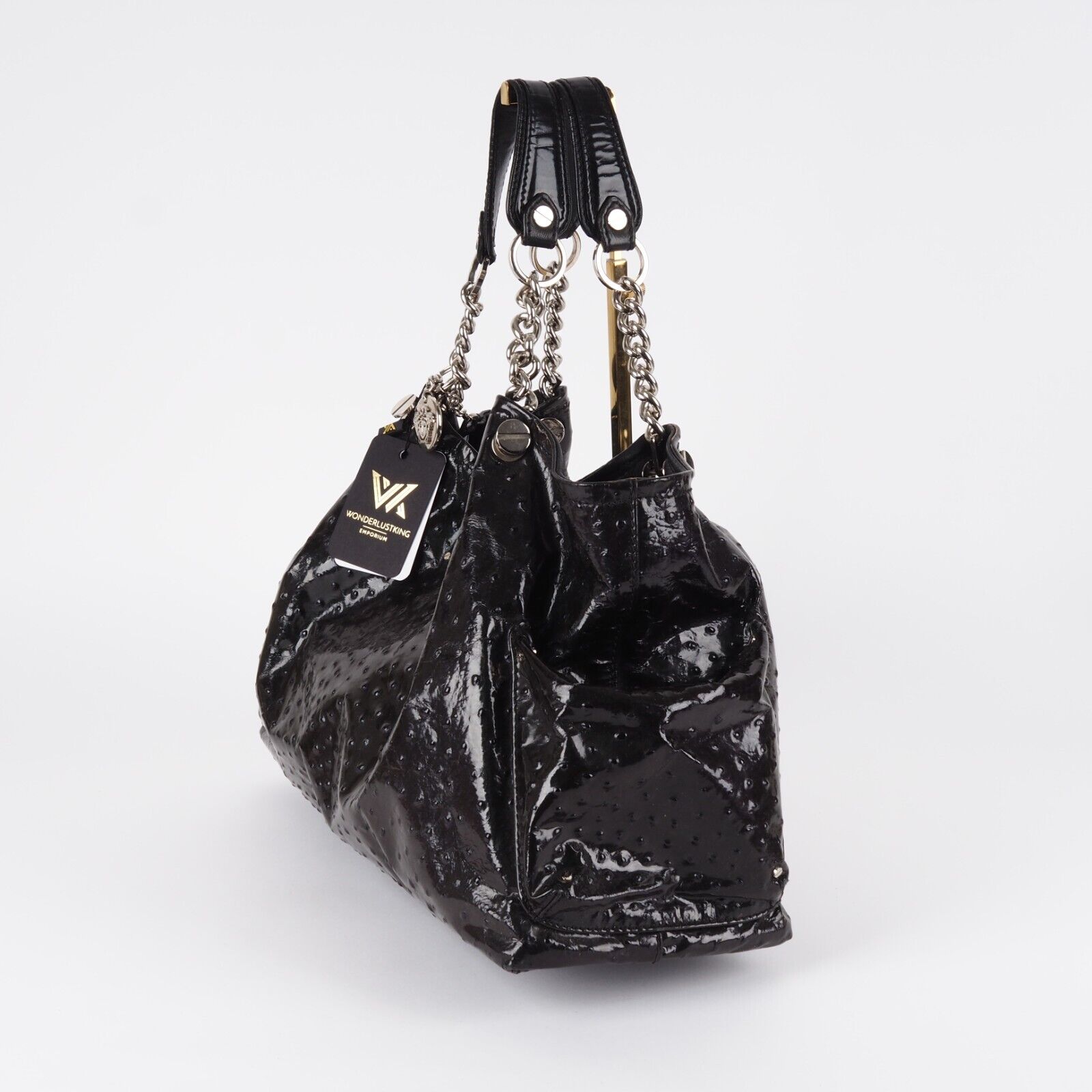 Diese wunderschöne Skarabeo Grüne Lackleder Tote Tasche von Gianni Versace wurde in Italien aus Straußenleder gefertigt.Innenfutter aus Satin. Innen und außen sauber und frei von Gerüche. In gepflegtem Zustand mit leichten Gebrauchspuren.