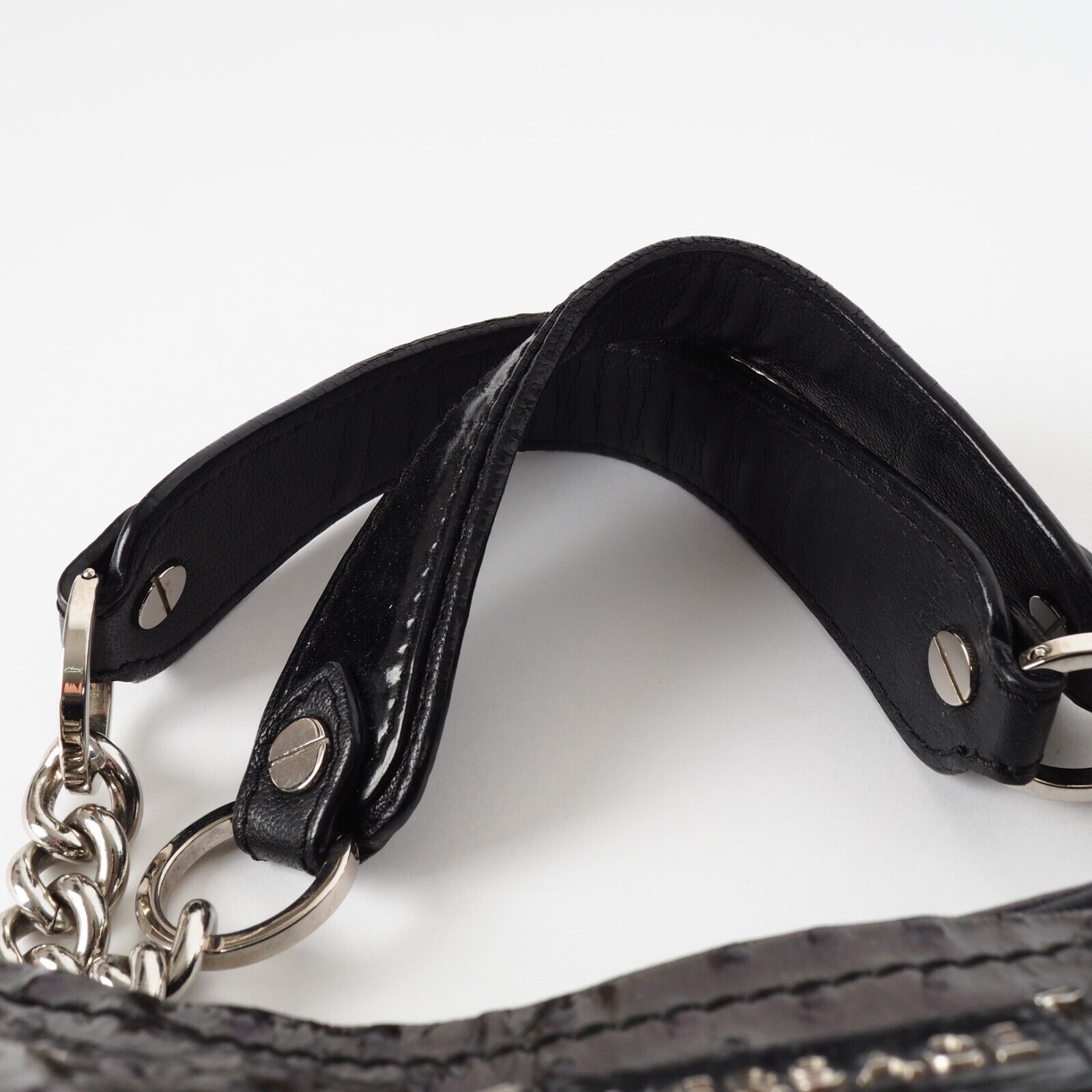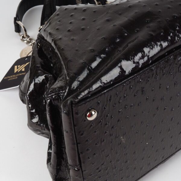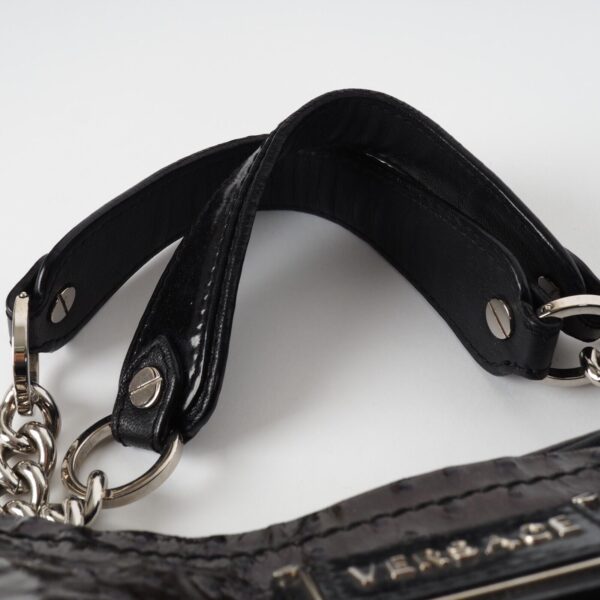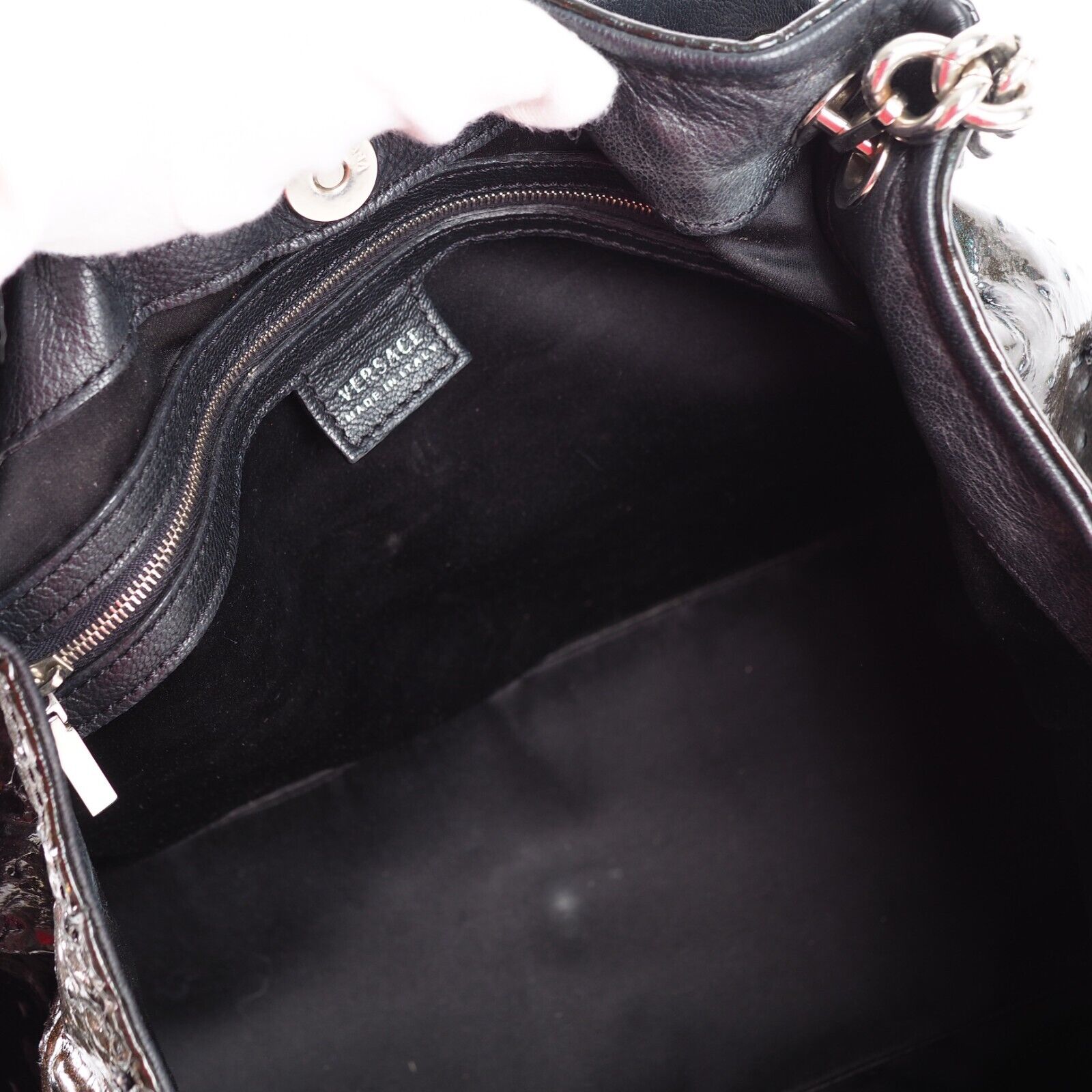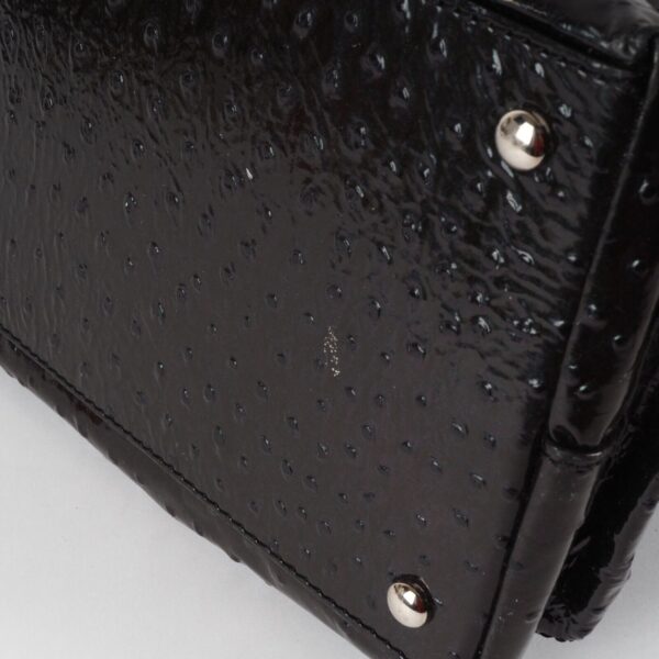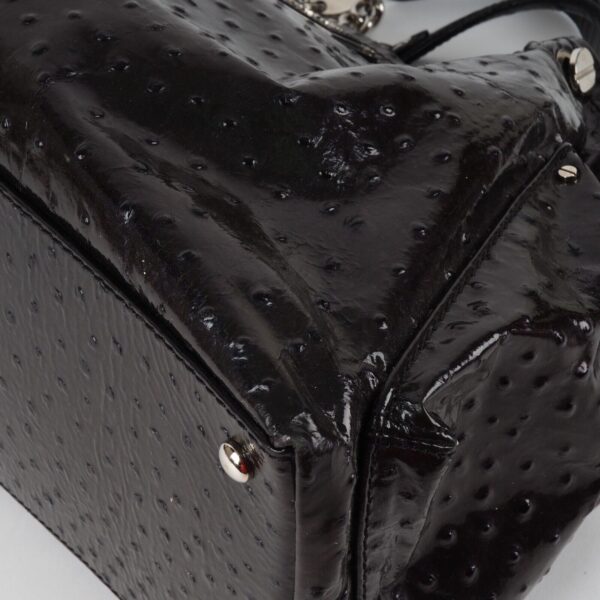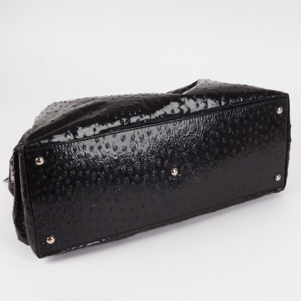 Diese wunderschöne Skarabeo Grüne Lackleder Tote Tasche von Gianni Versace wurde in Italien aus Straußenleder gefertigt.Innenfutter aus Satin. Innen und außen sauber und frei von Gerüche. In gepflegtem Zustand mit leichten Gebrauchspuren.