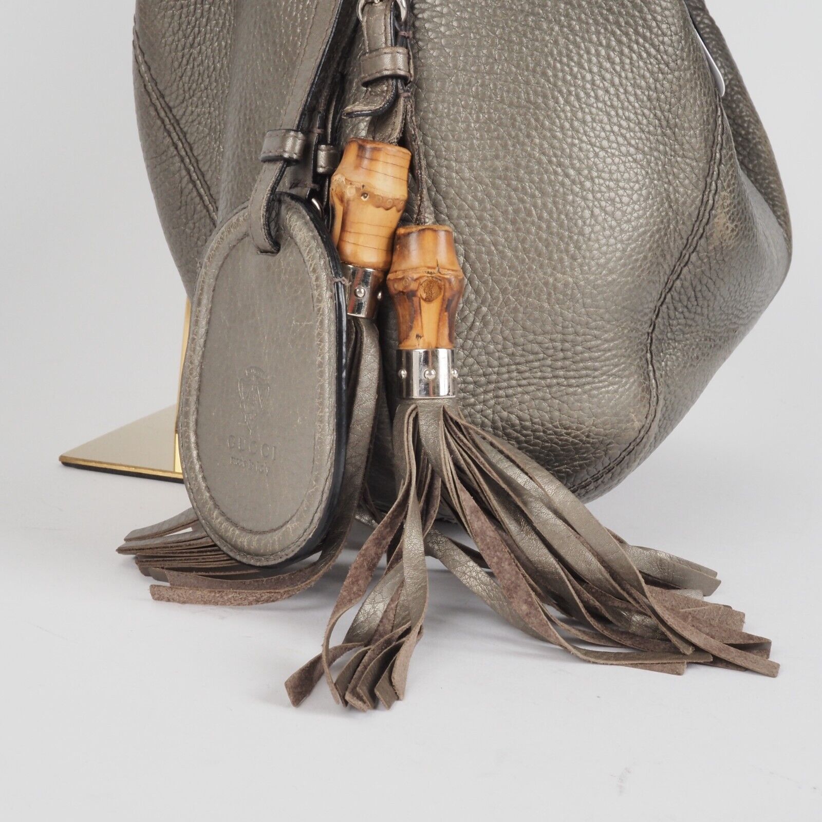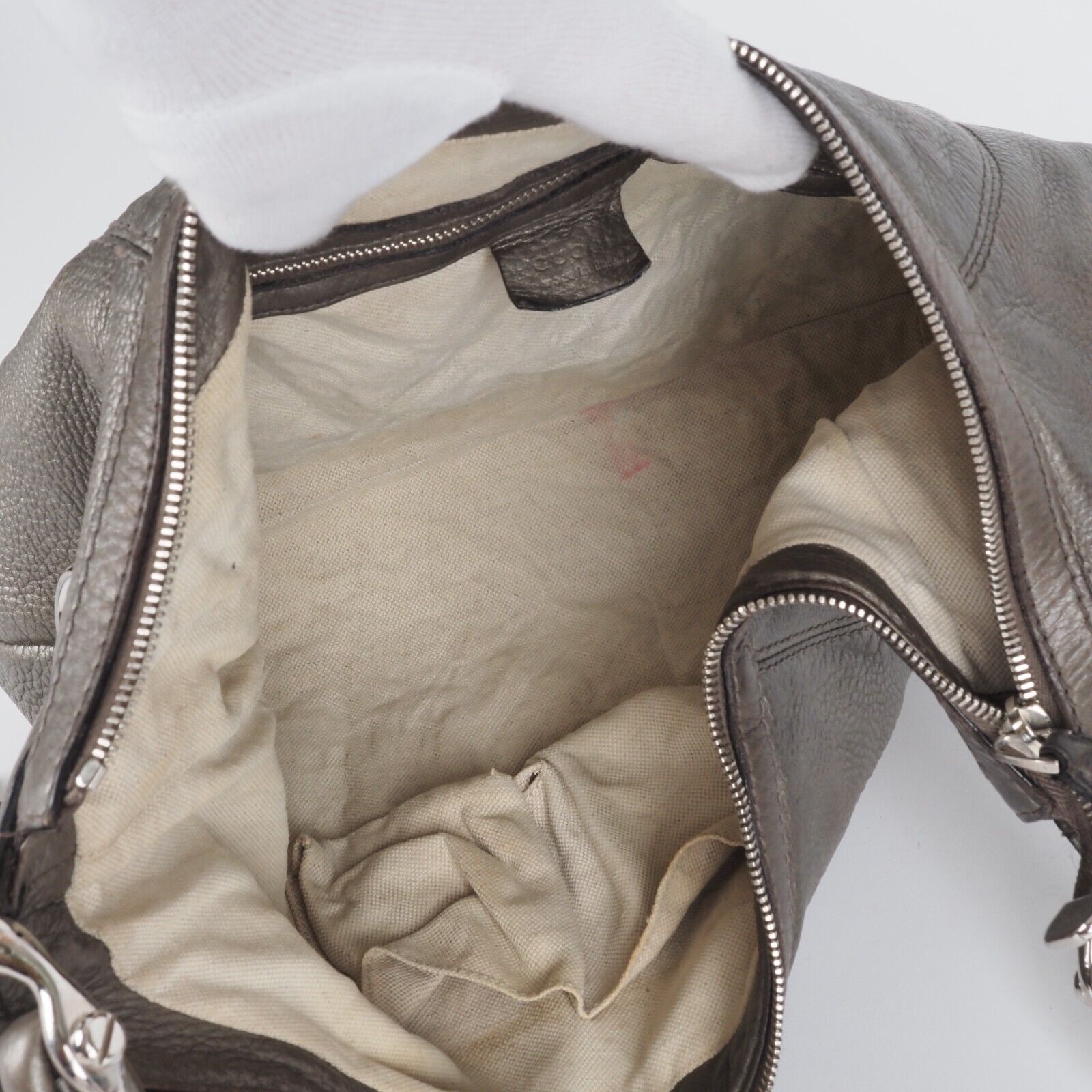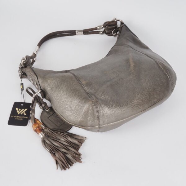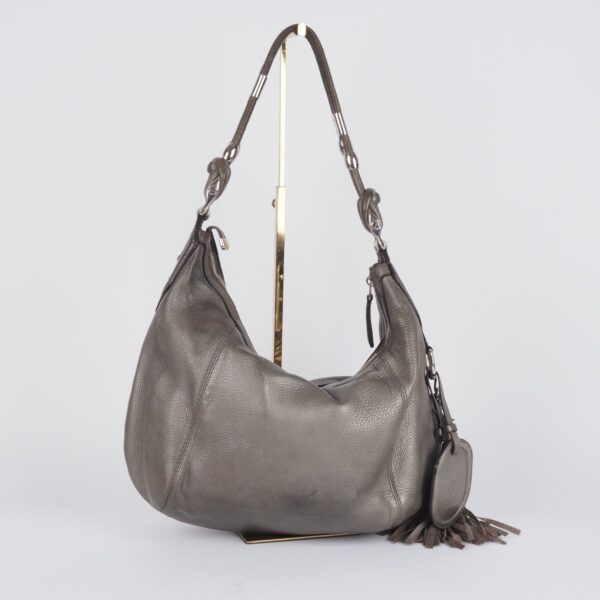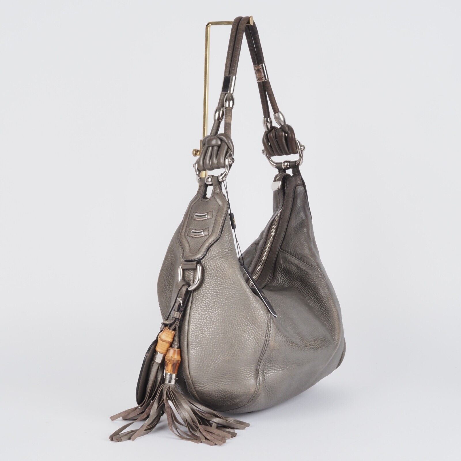 Diese stylische Techno Hobo Schultertasche von Gucci wurde in Italien aus Leder gefertigt. Die Tasche ist in ziemlich gebrauchtem Zustand mit deutlichen Gebrauchspuren so wie Abrieb, Kratzer, Flecken innen, Löcher innen. Riecht nach Waschmittel.