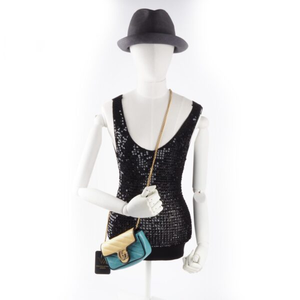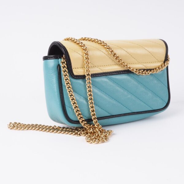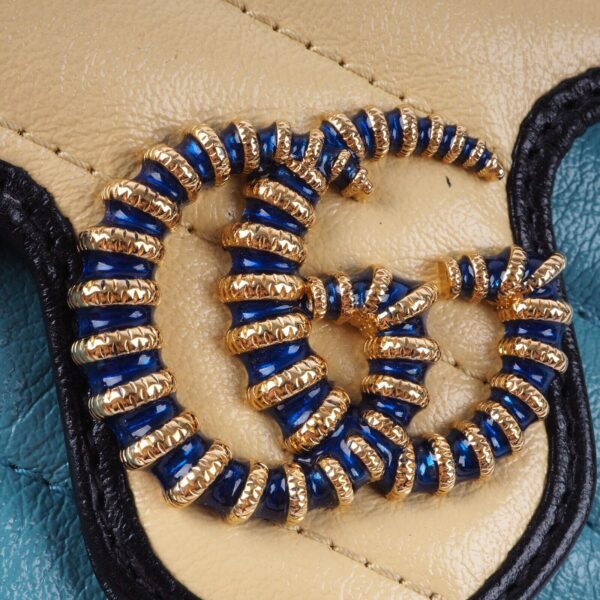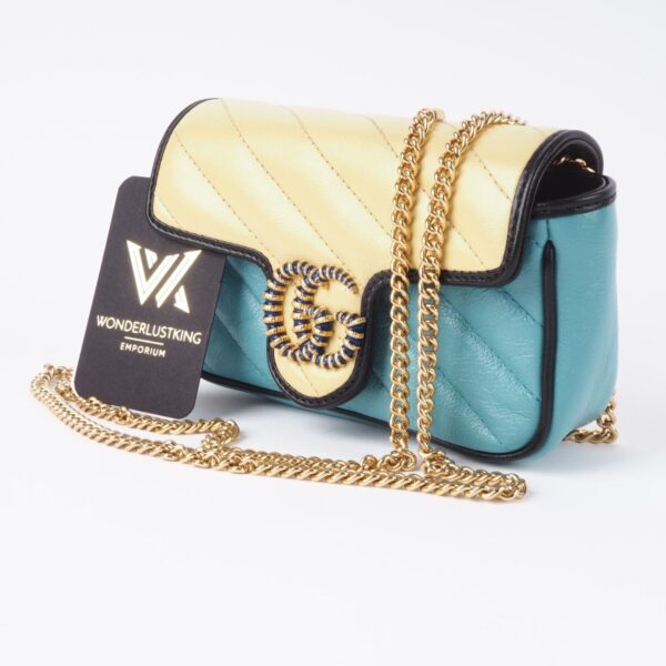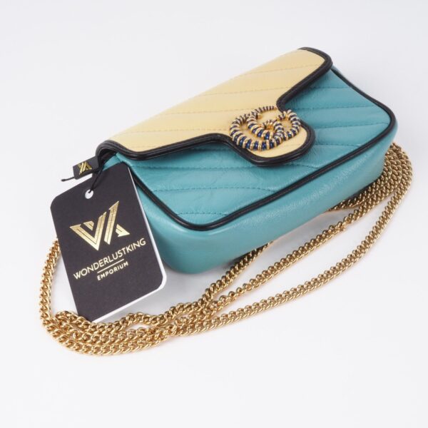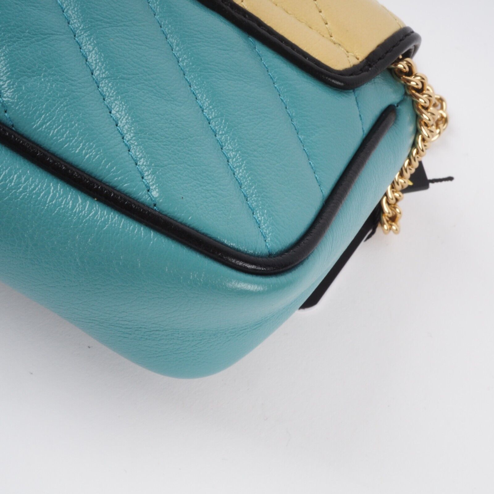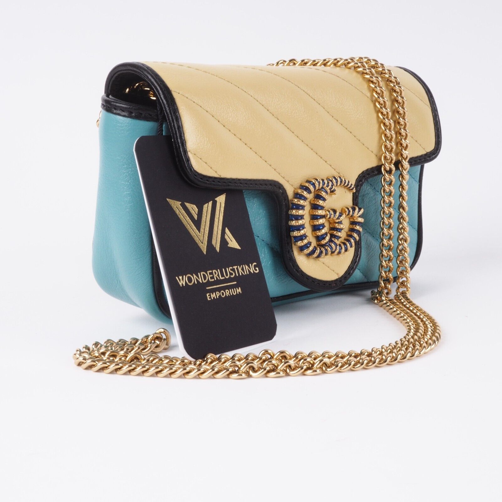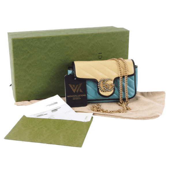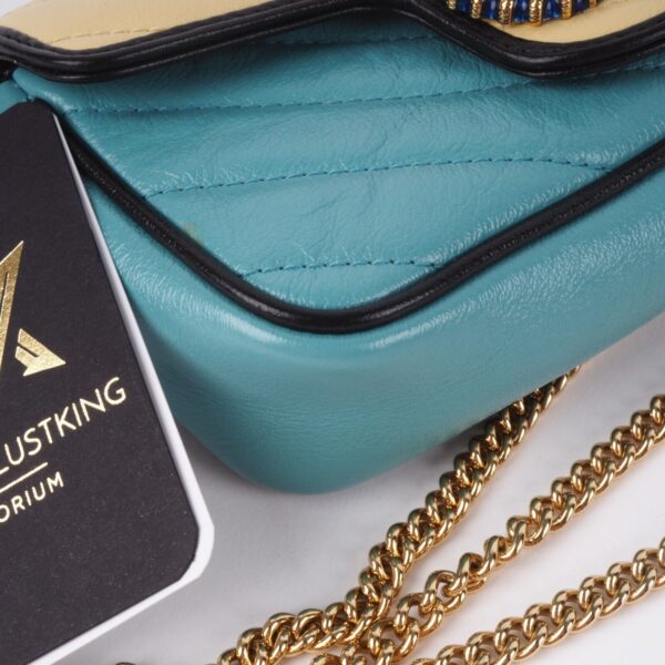 Diese wunderschöne mini Marmont Abendtasche von Gucci ist ein Limited Edition in Türkis und Vanillefarbe. Die Tasche wurde in 2021 in Italien aus feinem Leder handgefertigt. Die Tasche ist in absolut neuwertigem Zustand ohne erkennbare Gebrauchspuren. Innen und außen sauber, frei von Gerüche. Kommt mit der Originalrechnung, Karton, Staubbeutel und Echtheitszertifikat.