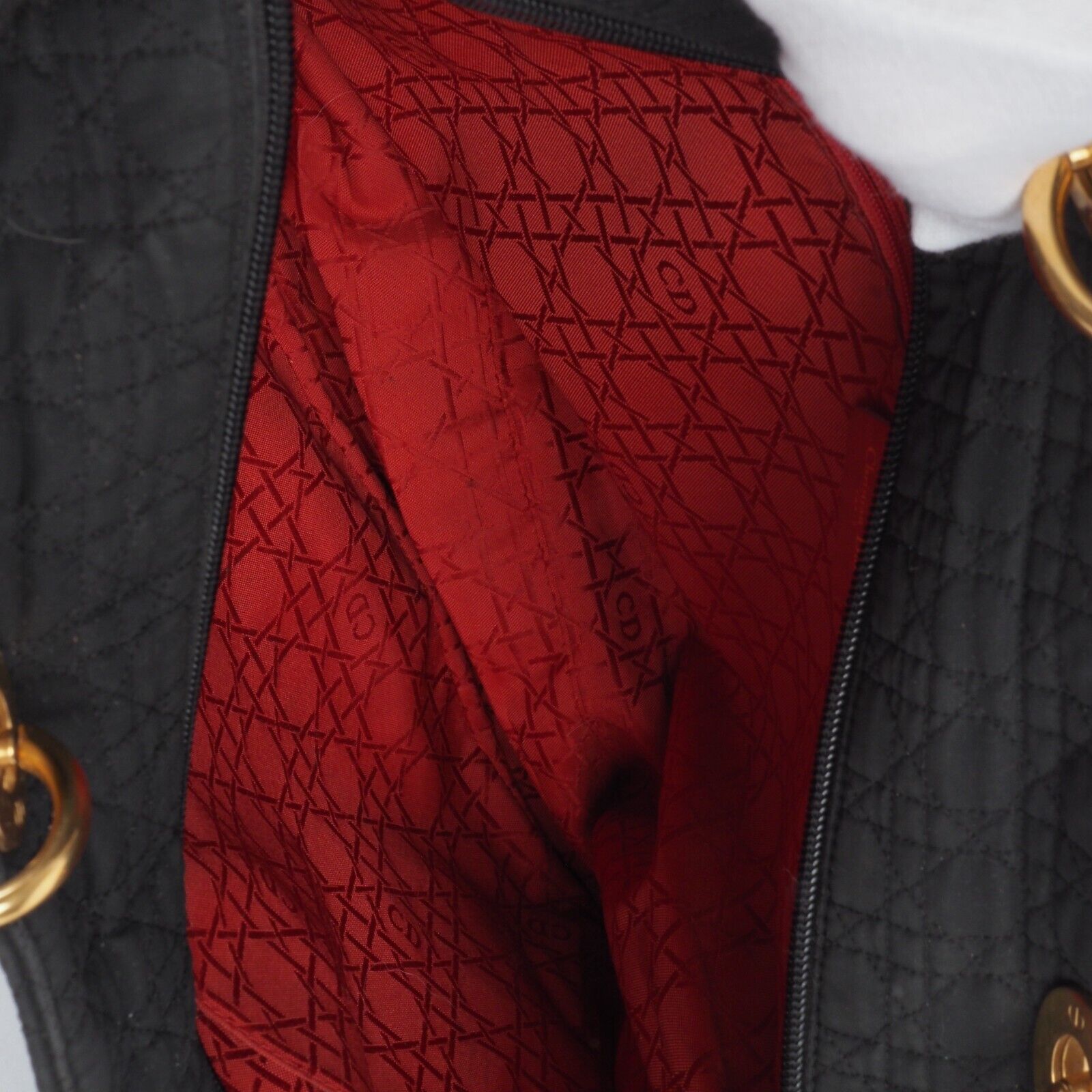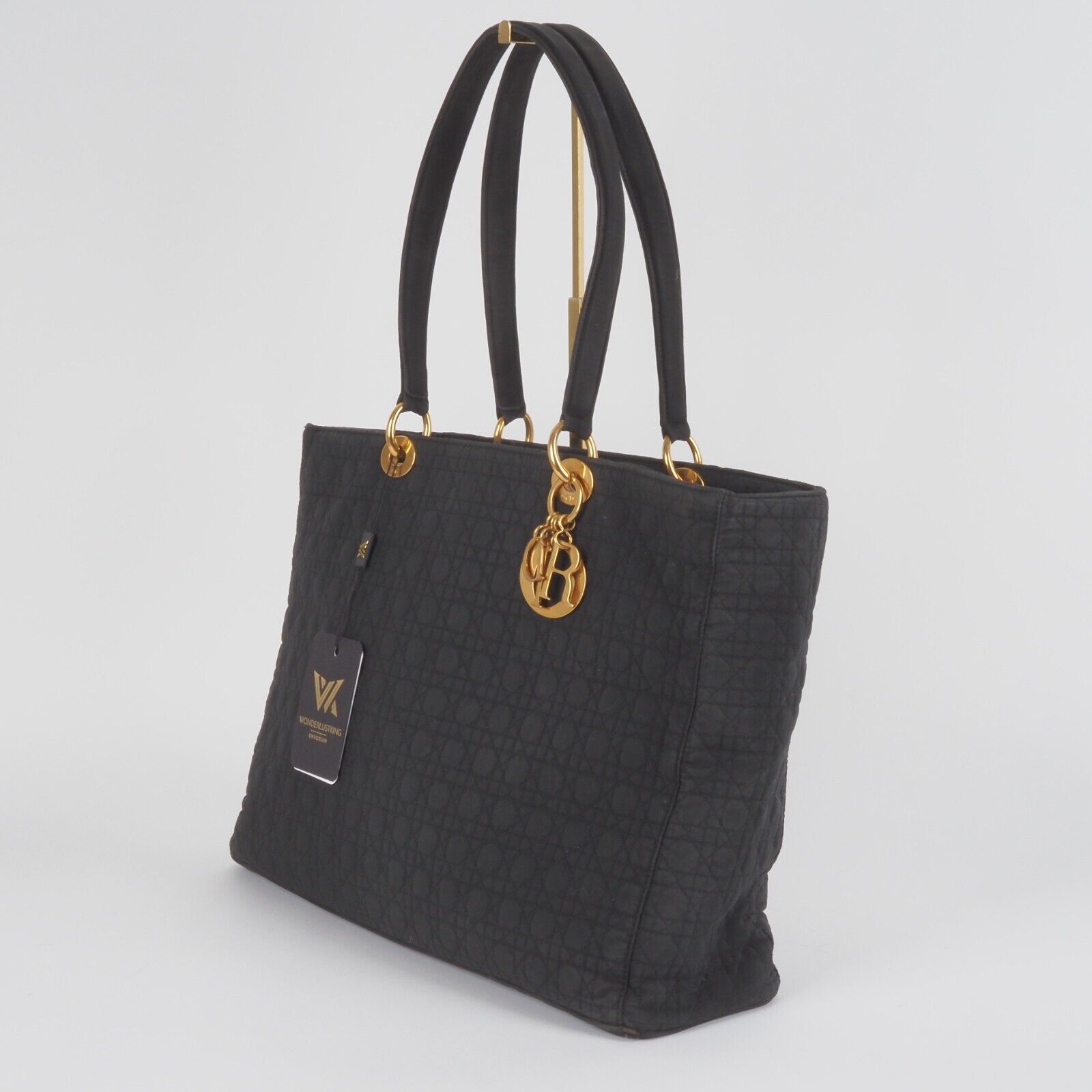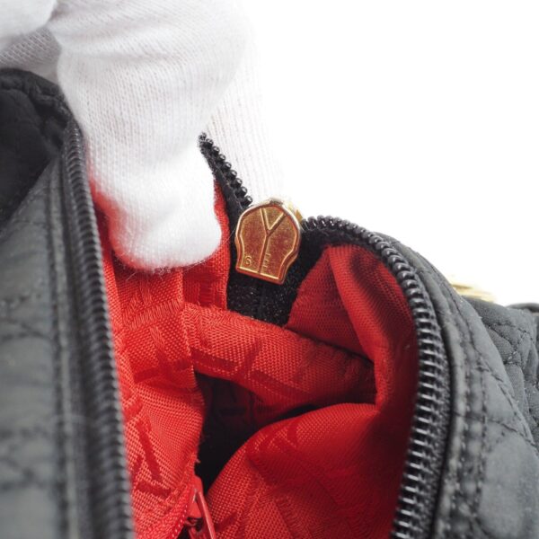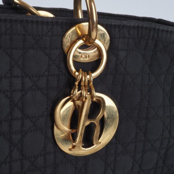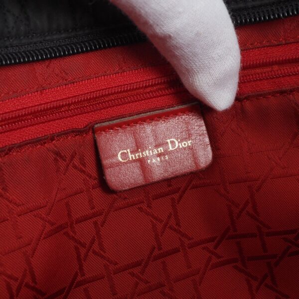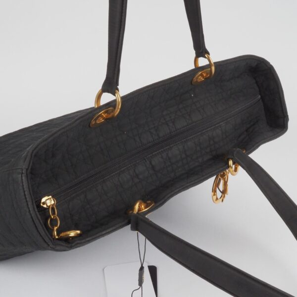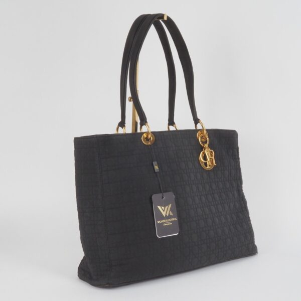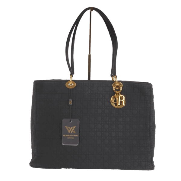 Diese schöne Cannage Medium Handtasche wurde in 1998 Jahren in Italien Handgefertigt. Sie ist außen schwarzem Stoff mit goldener Hardware. Innen Nylon mit klassischem Dior Logofutter. Die Tasche ist in relativ gutem Vintage Zustand. Die Hardware hat leichten Kratzer. Innen und außen relativ sauber. Die Ecken sind unten leicht verschlissen. Die eingebaute Seitenwände sind leicht verbogen.