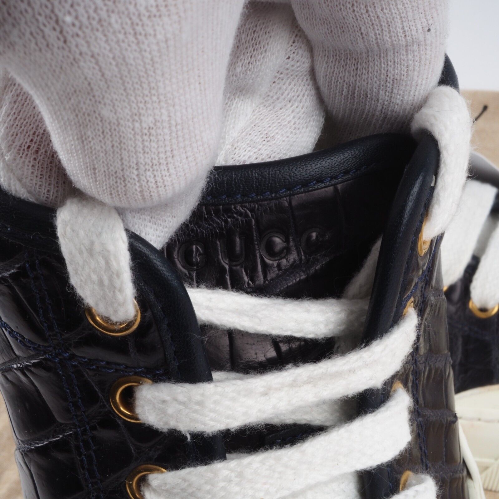 Diese stylische Low-Top Sneakers von GUCCI wurden aus hochwertigem Leder mit Kroko-Prägung in Italien handgefertigt. Die Schuhe sind neuwertig, nur paarmal getragen. Mit minimalen Gebrauchspuren, innen und außen sauber und frei von Gerüche. Gr. 9 (~EU 42,5)