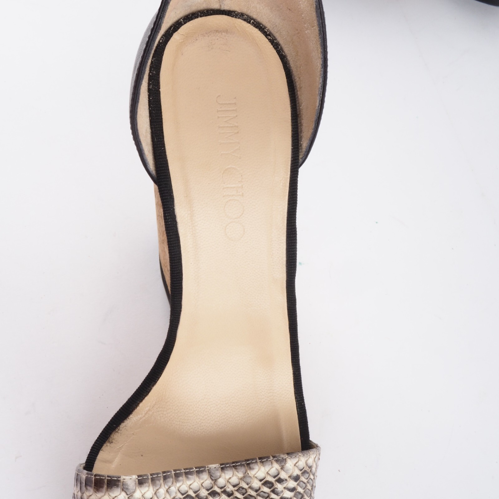 Diese stylische auffällige Neston Sandalen con JIMMY CHOO warein in Italien handgefertigt. Laufsohle aus Gummi, Innensohle Leder. Riemen aus echtem Schlangenleder. Absatz uns Platform aus Kork. Mit besonders hohem Absatz von ca. 12 cm. Platform 3 cm. Gr. 40 In gutem gebrauchten Zustand mit leichten Gebrauchspuren.