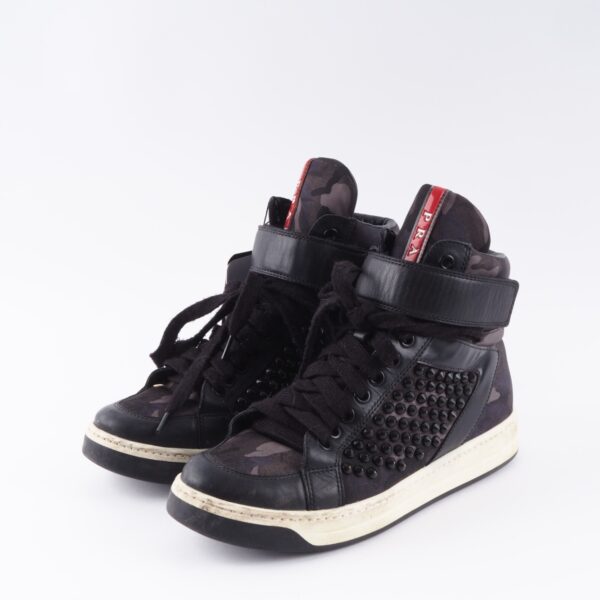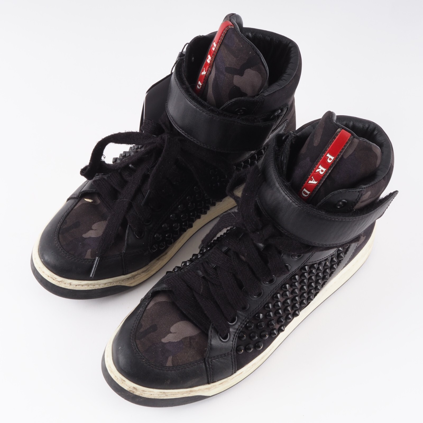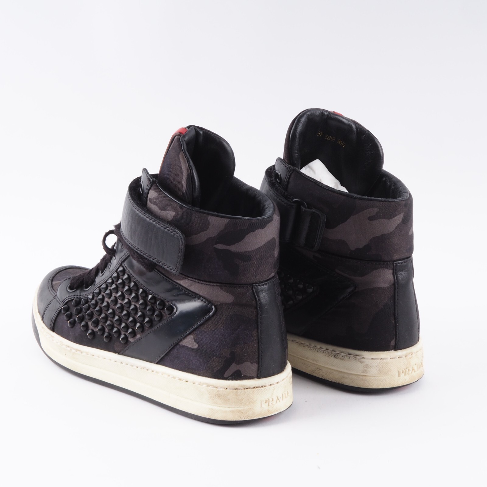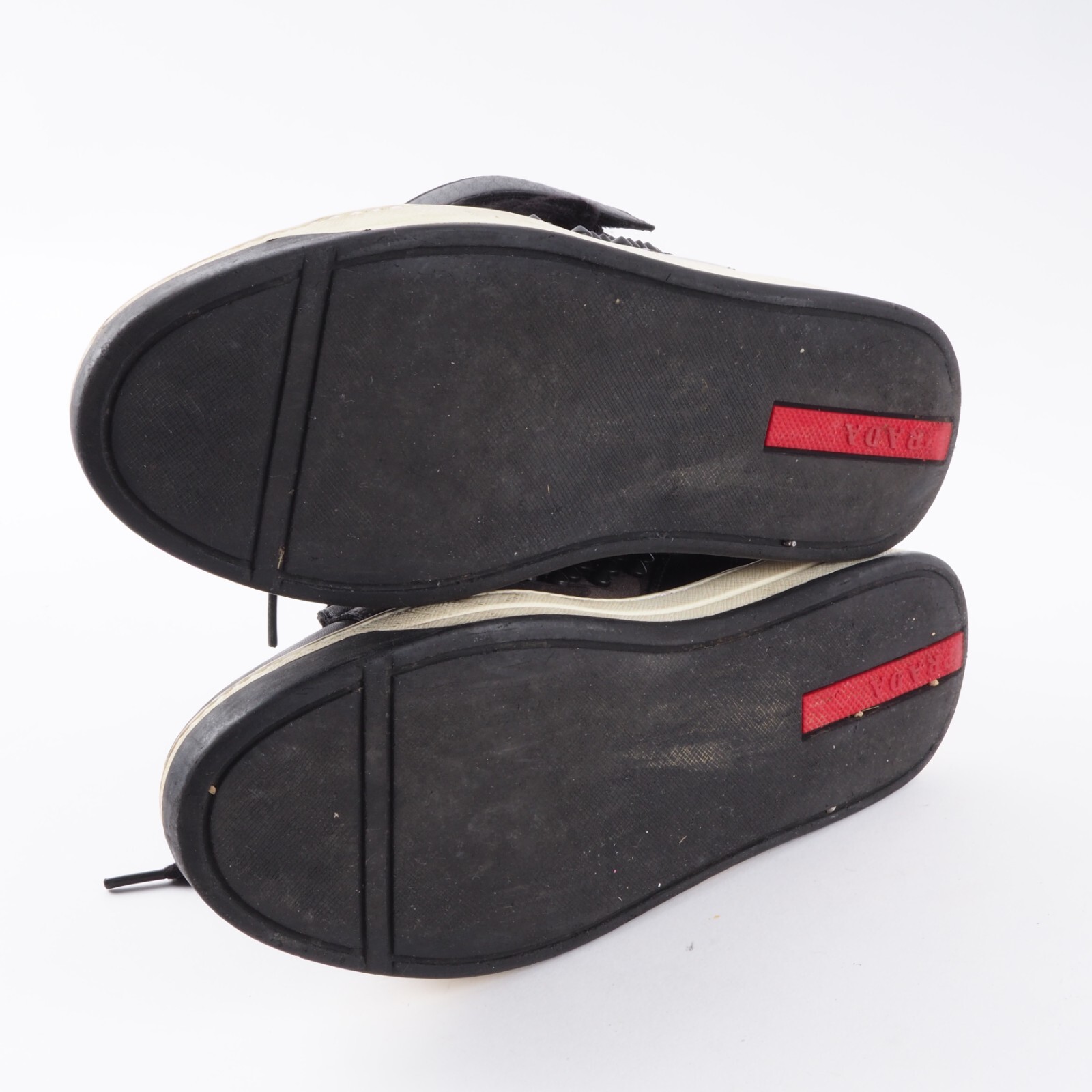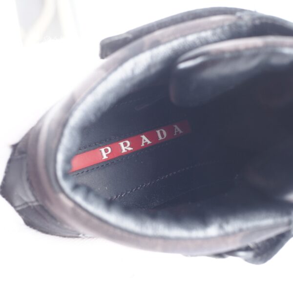 Diese stylische Hihg-Top Sneakers von PRADA sind in gutem gebrauchten Zustand mit leichten Gebrauchspuren sowie kleinen Kratzer und Abreibungen. Die Laufsohle weißt ca. 20% Verschleiß auf. Siehe Bilder. Gr. 36,5